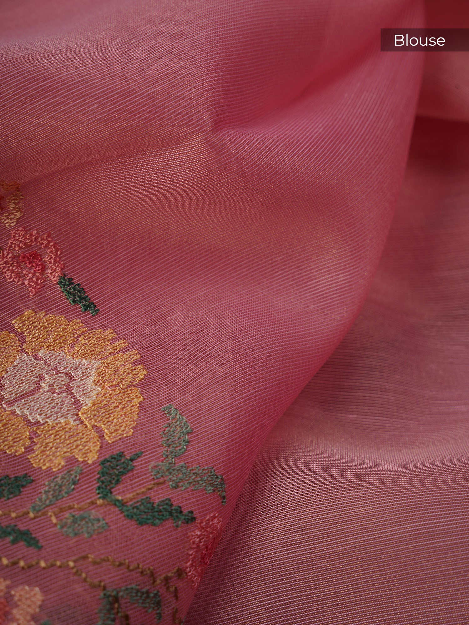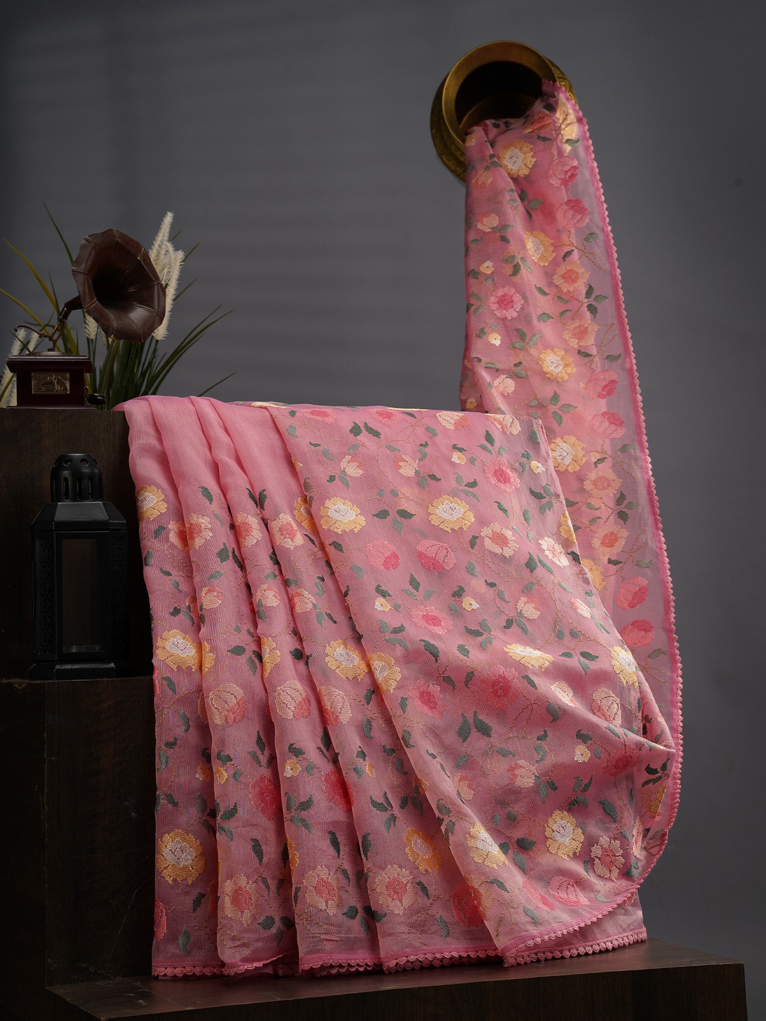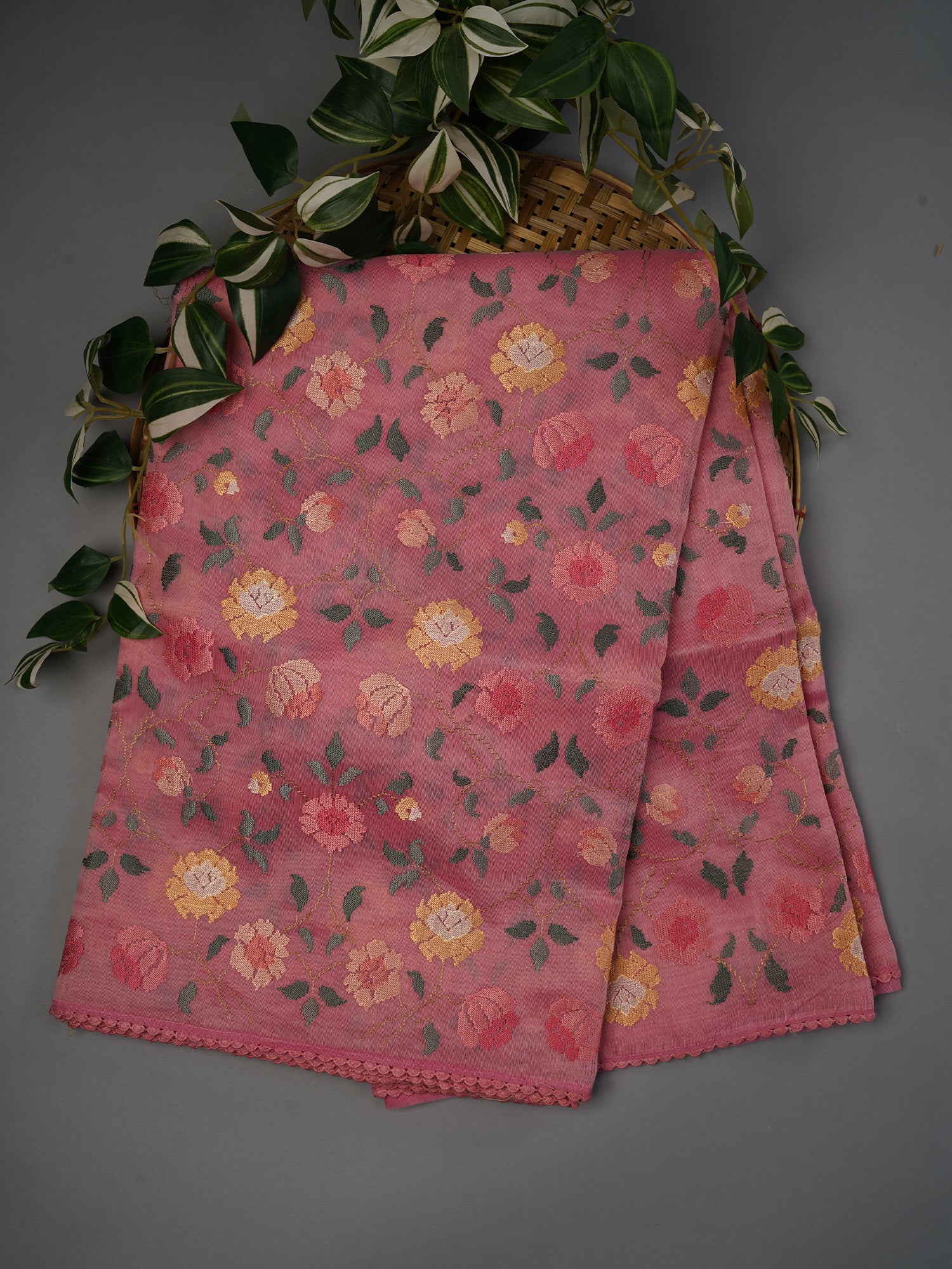 Tissue Linen Saree With Thread Embroidery with Lace Border - Light Pink