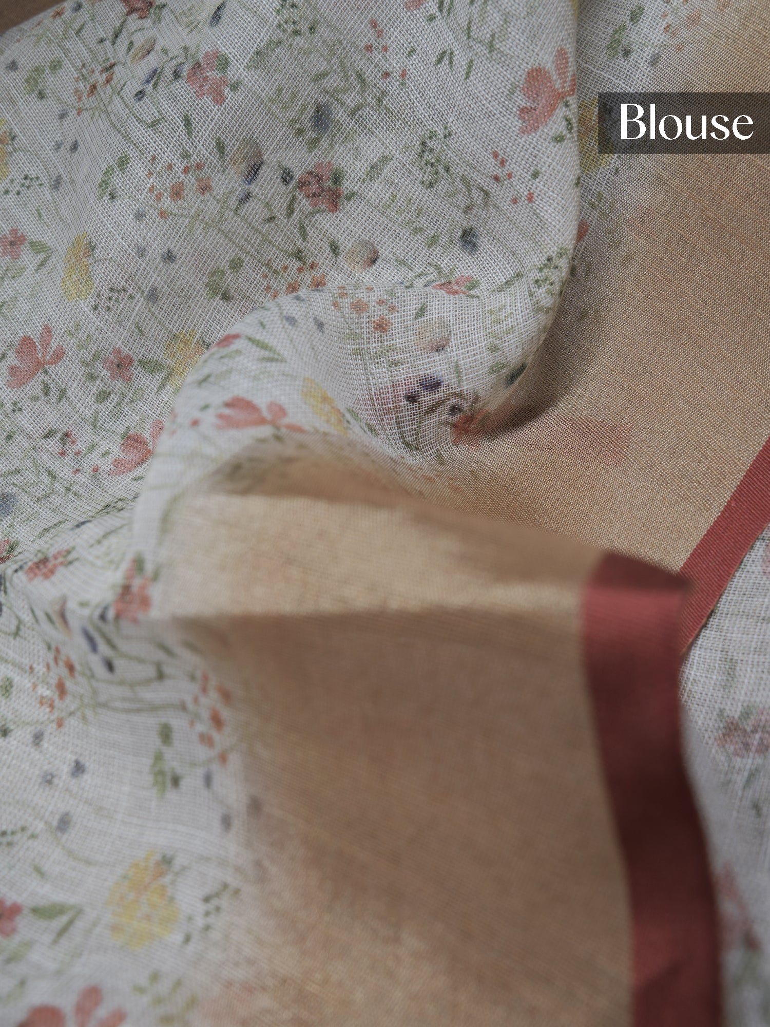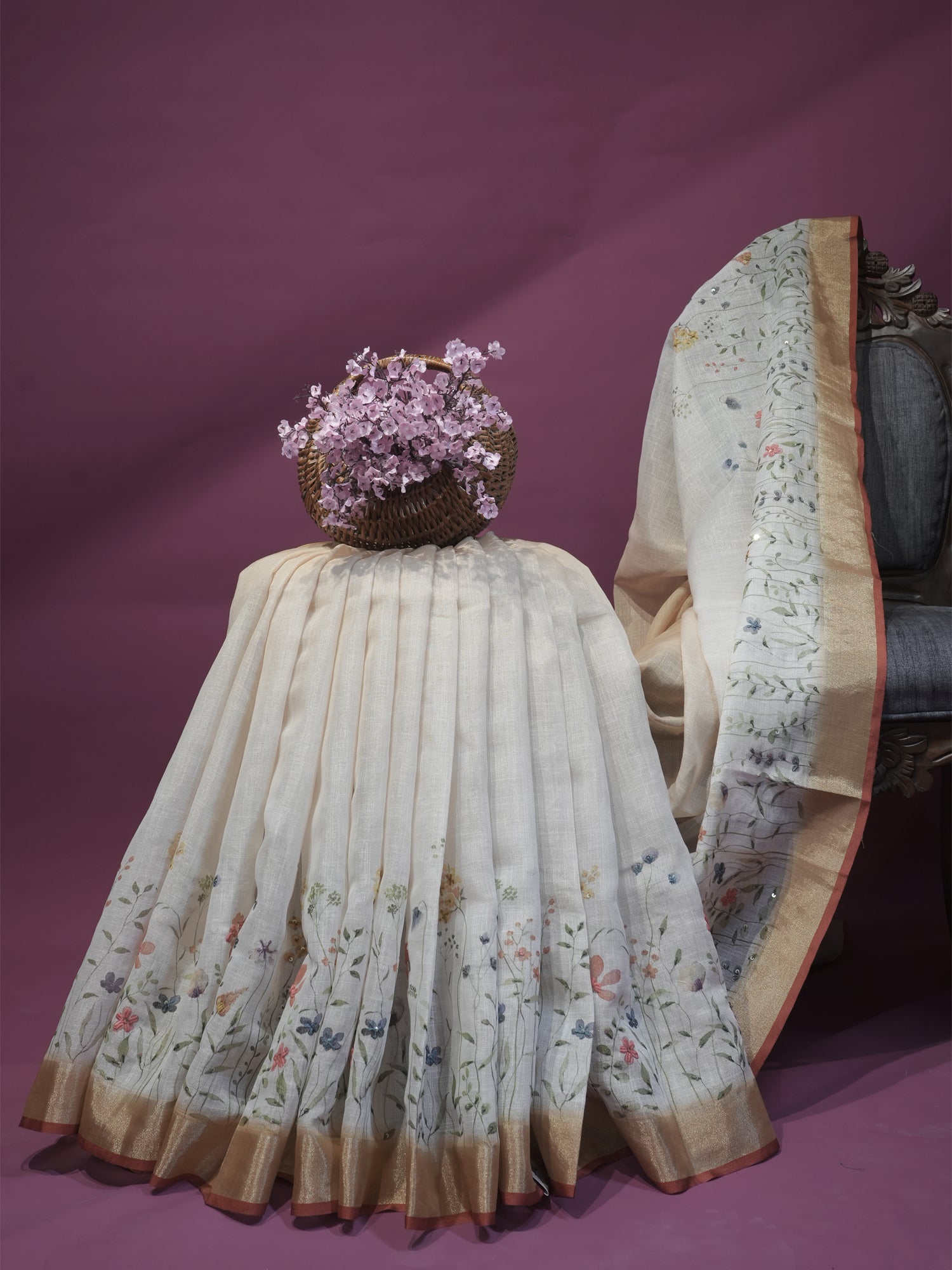 Drape yourself in effortless elegance with this stunning tissue linen silk saree. The delicate floral print in warm beige and...