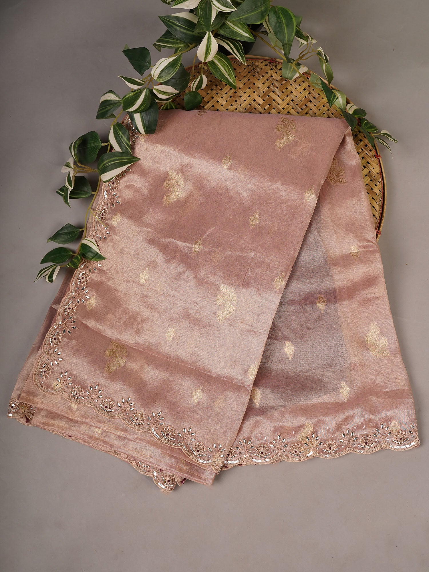 Tissue Organza Banaras Buttis Scallop Border Zardoise Stone Work - Peach