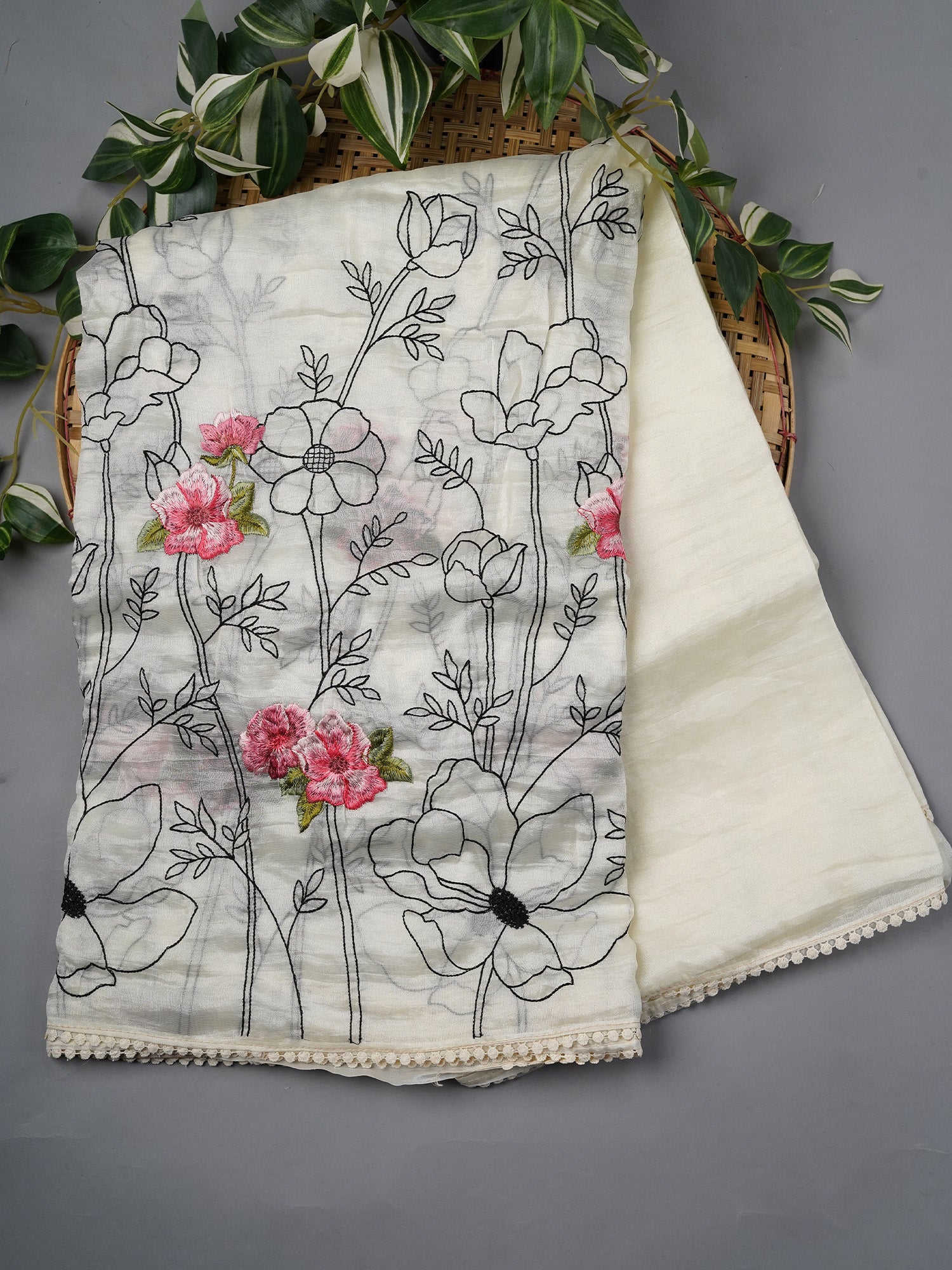 Tissue Organza Silk with Thread Embroidery Work lace Border- White