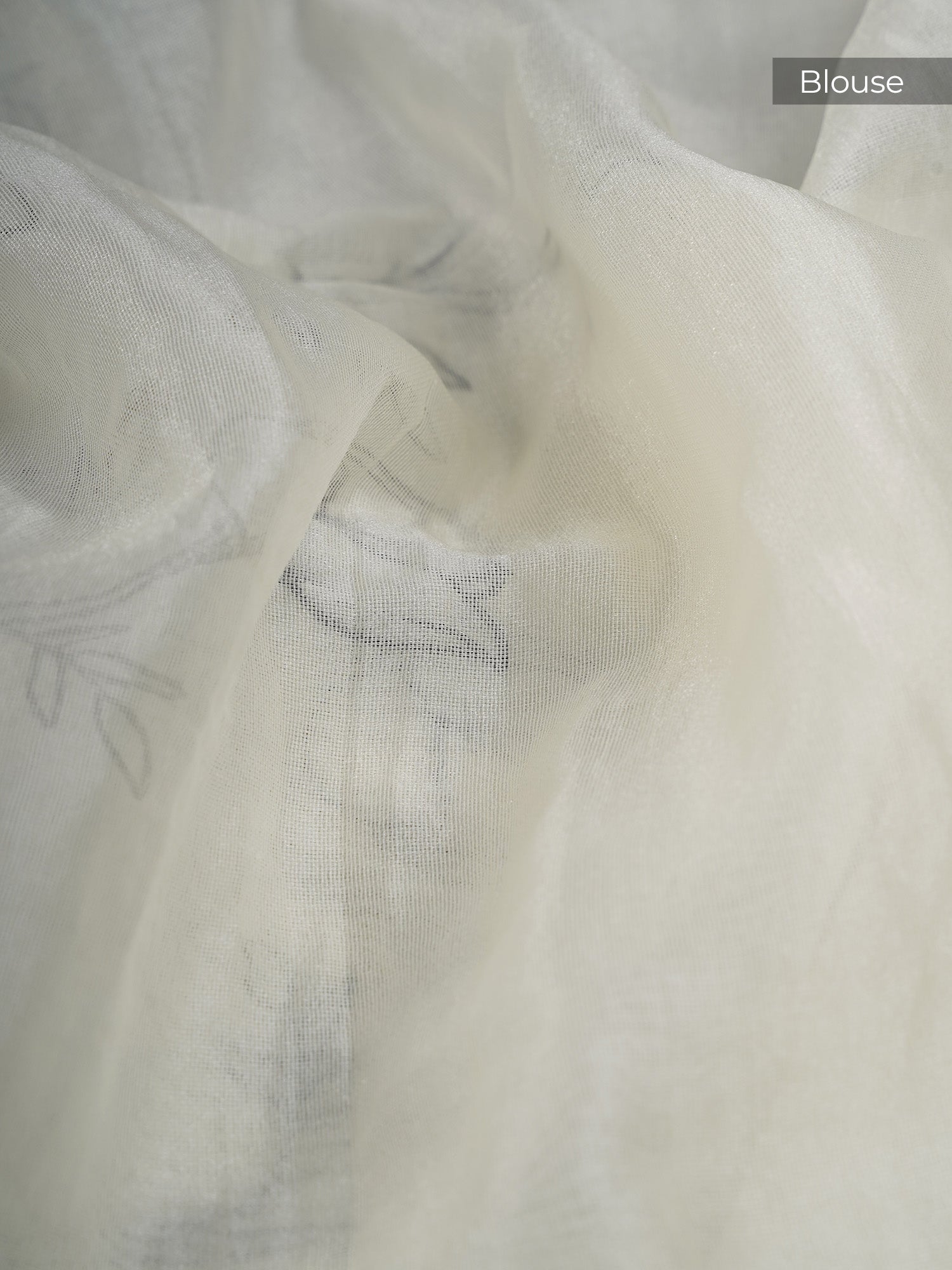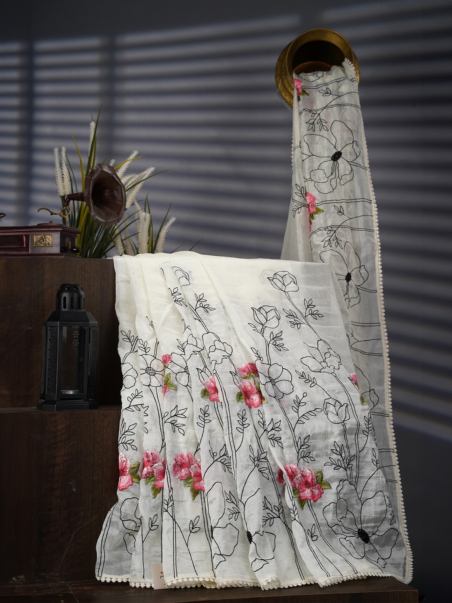 Delicate tissue organza silk meets intricate artistry in this stunning white saree. Adorned with hand-crafted thread embroidery work and an...