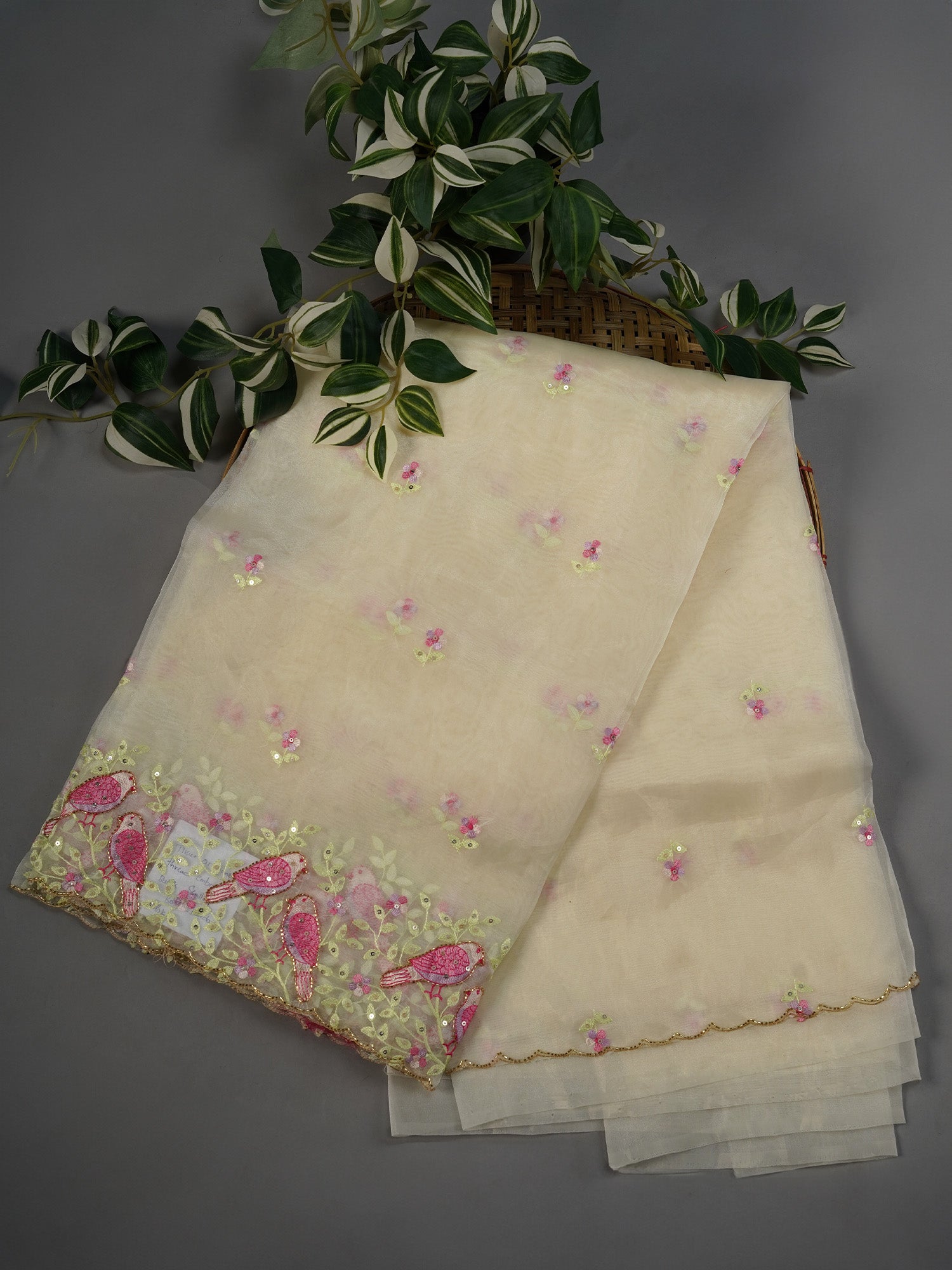 Tissue Organza Thread Embroidery Buttis with Scallop Border Kardana Work - Off White