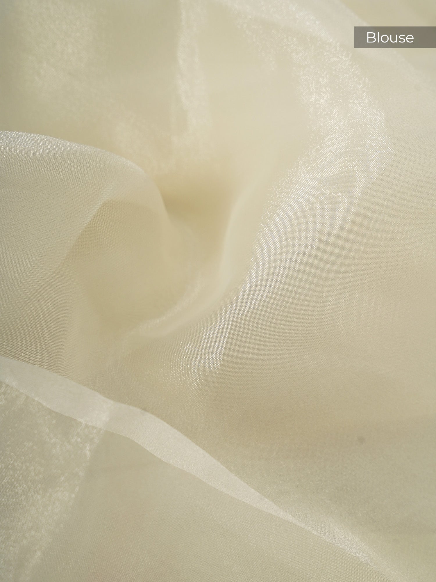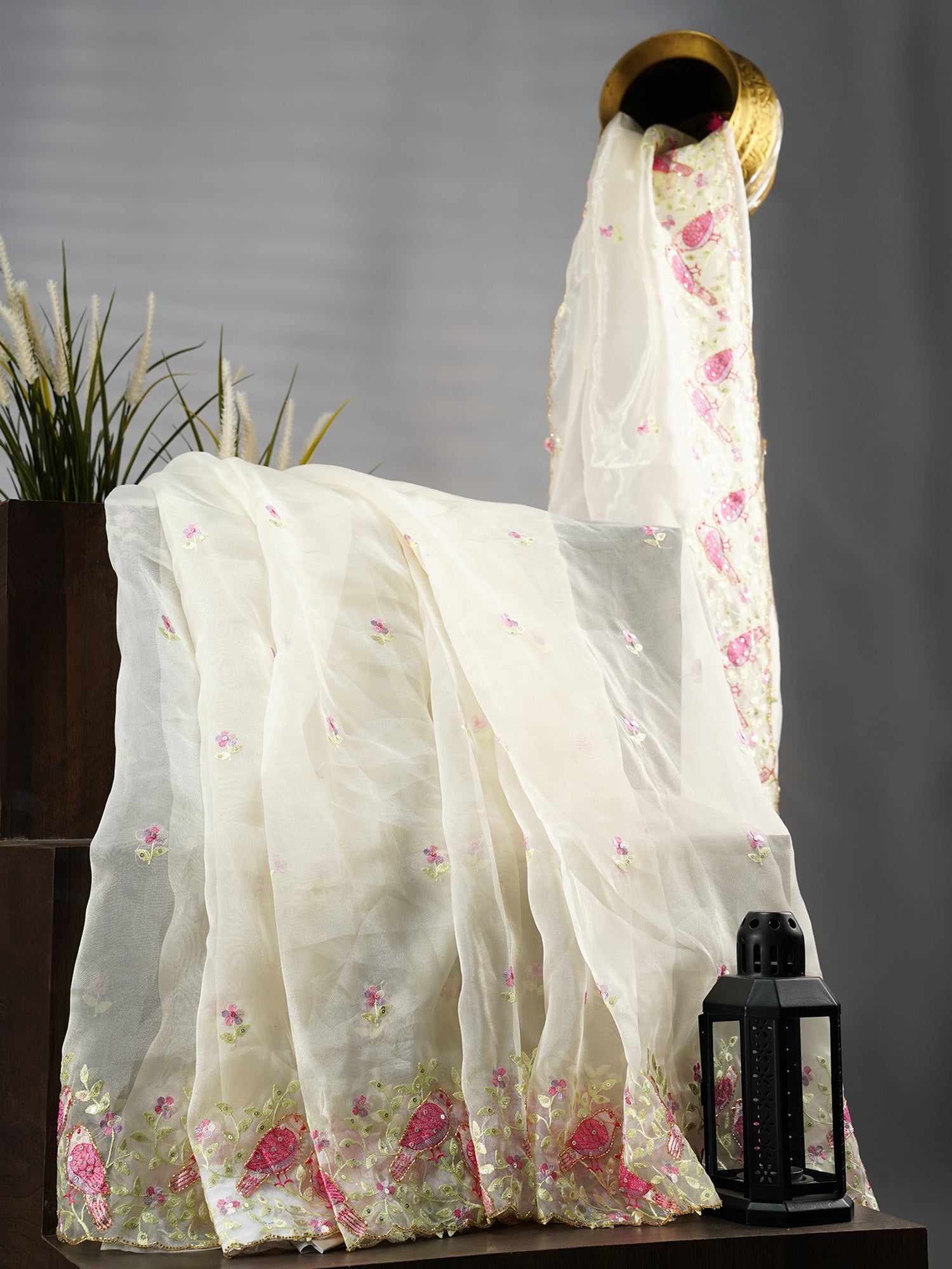 This exquisite off-white tissue organza fabric features delicate thread embroidery with intricate butti motifs, showcasing skilled craftsmanship. The scallop border...