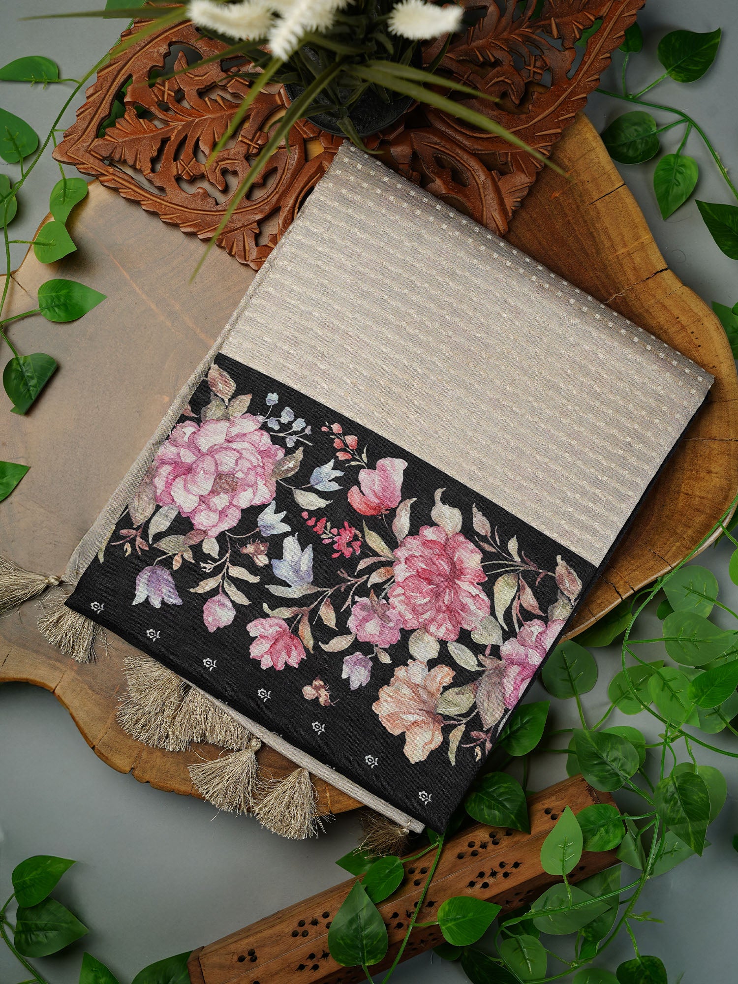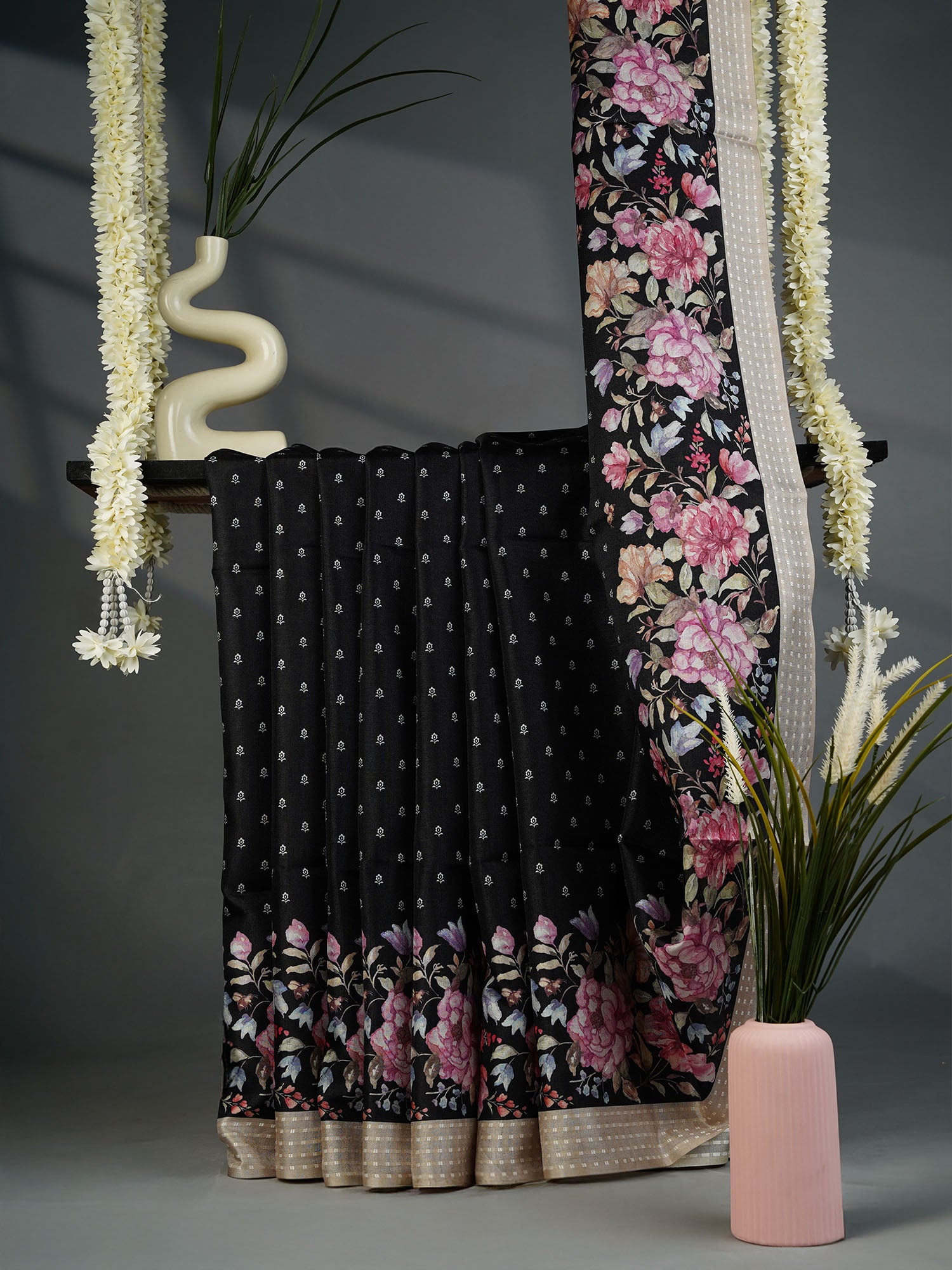 Tissue Silk Saree with Floral Print and Subtle Vertical Stripes and Small Delicate Motifs- Black