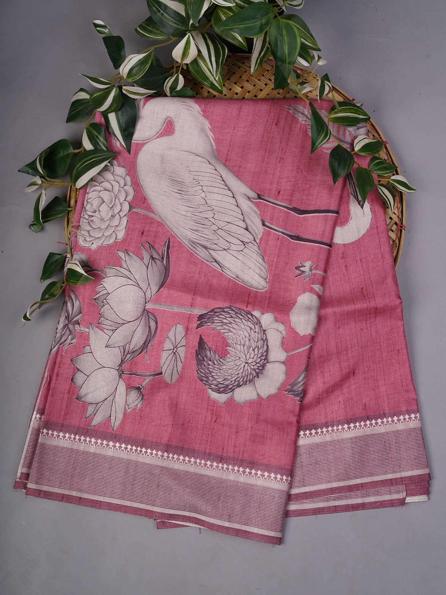 Elevate your ethnic wardrobe with this exquisite tissue silk saree, where traditional craftsmanship meets contemporary design. The delicate tissue silk fabric drapes beautifully, offering a lightweight yet luxurious feel perfect for any occasion. Adorned with vibrant digital prints that showcase intricate patterns, this saree captures attention with its modern aesthetic. The meticulously crafted thread border adds a refined finishing touch, enhancing the overall elegance of the piece. The soft pink hue complements all skin tones, making it a versatile choice for celebrations, festivals, or formal gatherings. An investment in timeless style that seamlessly blends tradition with innovation.
