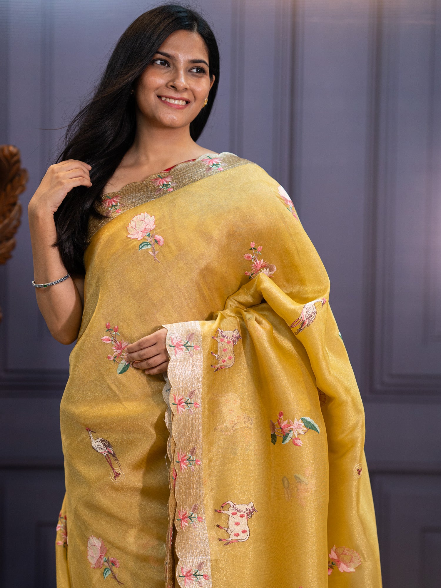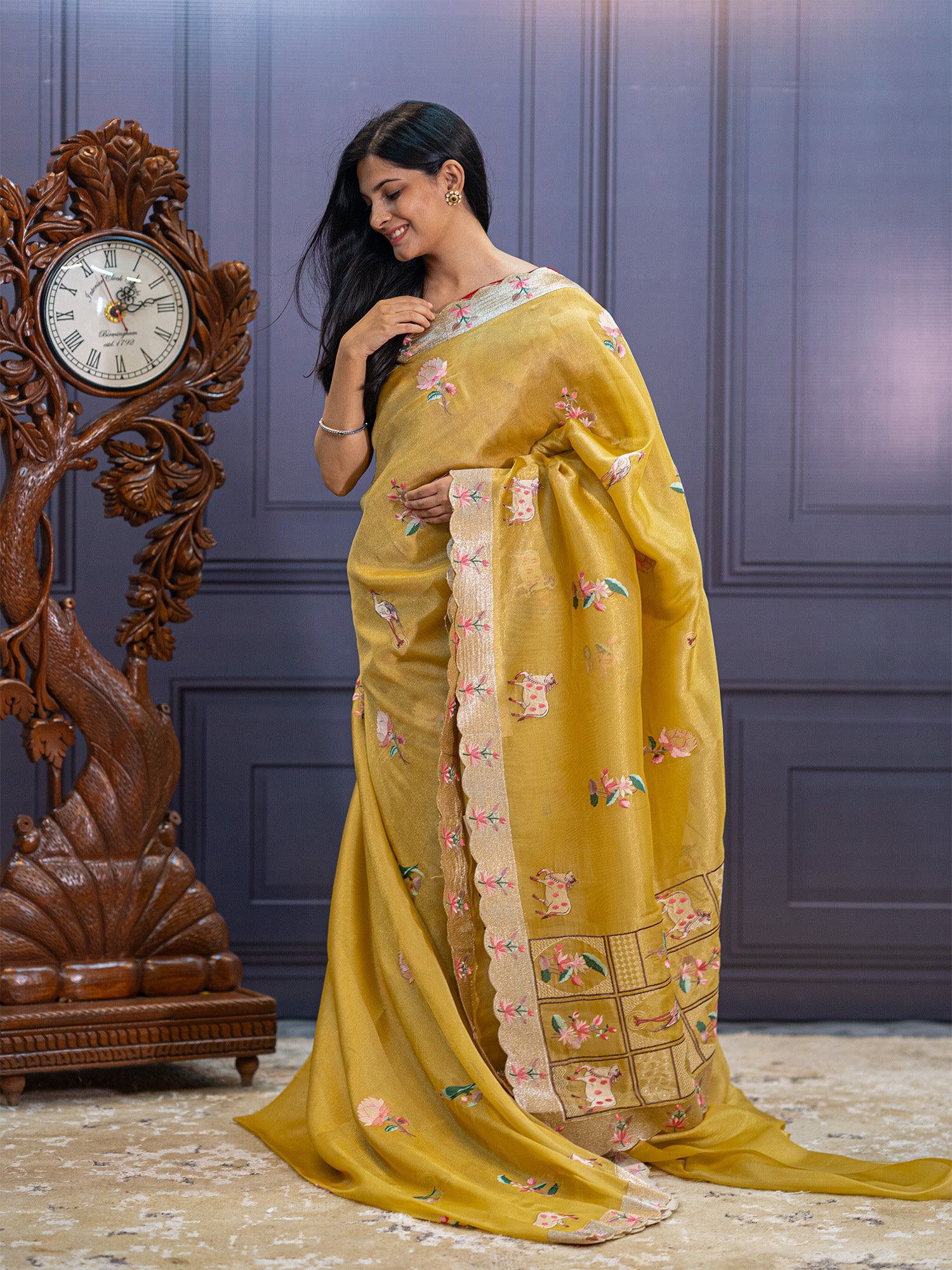 Tissue Soft Organza Silk with Zari & Thread Embroidery, Pichwai design -