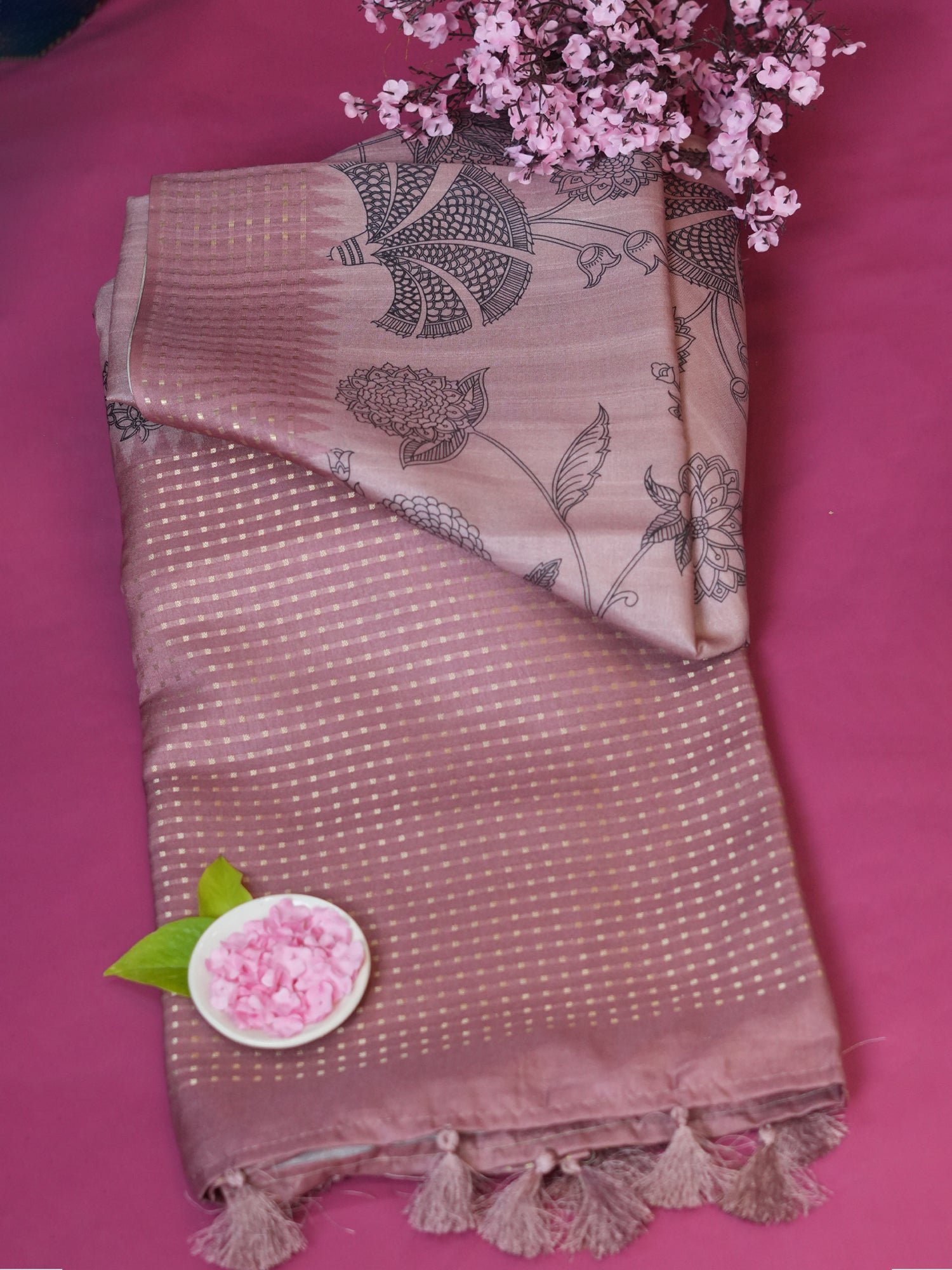 Tussar silk meets timeless elegance in this stunning saree, where delicate floral prints dance across the fabric with playful charm. The weaving check border adds a sophisticated touch, creating beautiful contrast and visual interest. Rendered in a soft, sophisticated onion pink shade, this piece transitions effortlessly from festive celebrations to intimate gatherings. The natural texture of tussar silk drapes beautifully while maintaining its signature subtle sheen, making you feel both comfortable and radiant. Perfect for those who appreciate traditional craftsmanship with a modern sensibility.
