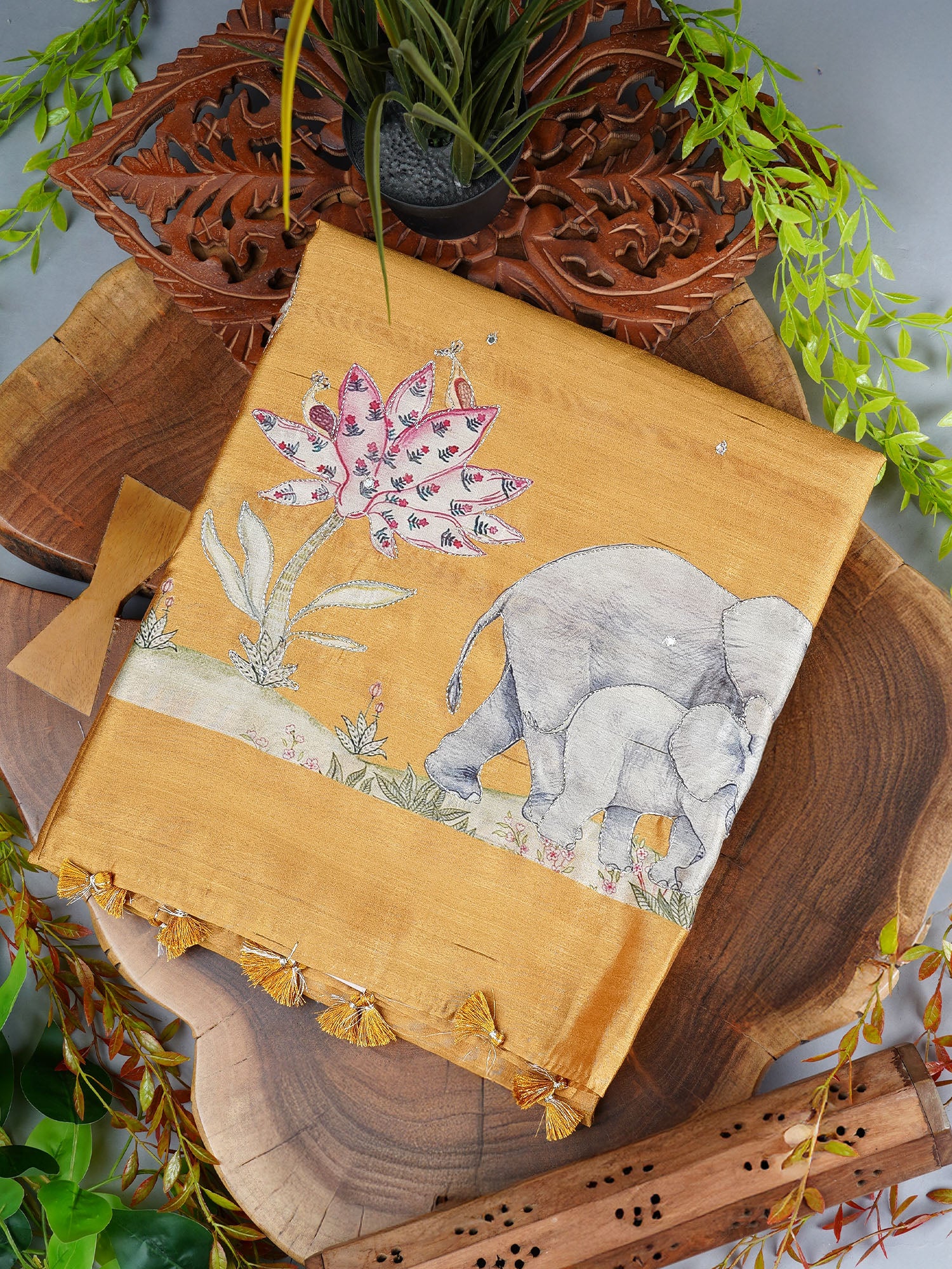 Elevate your ethnic wardrobe with this stunning Tussar silk saree that's pure magic. The luxurious Tussar fabric drapes beautifully, while intricate mirror work catches light from every angle—creating an enchanting sparkle that turns heads. Delicate ari embroidery adds layers of artisanal charm, making this piece a conversation starter at any celebration. The rich mustard hue brings warmth and sophistication, perfect for festive occasions or when you want to feel absolutely radiant. A timeless investment that blends traditional craftsmanship with contemporary flair.