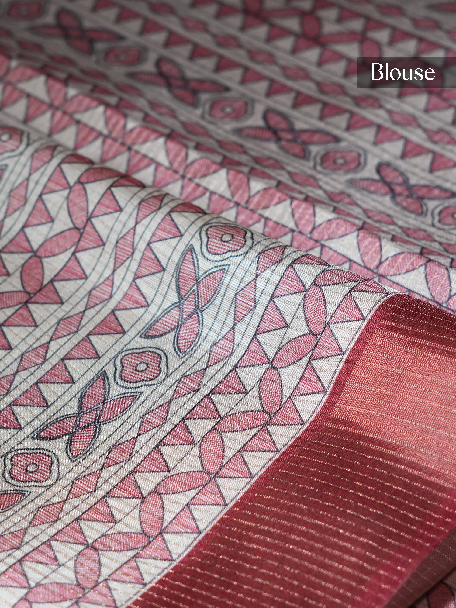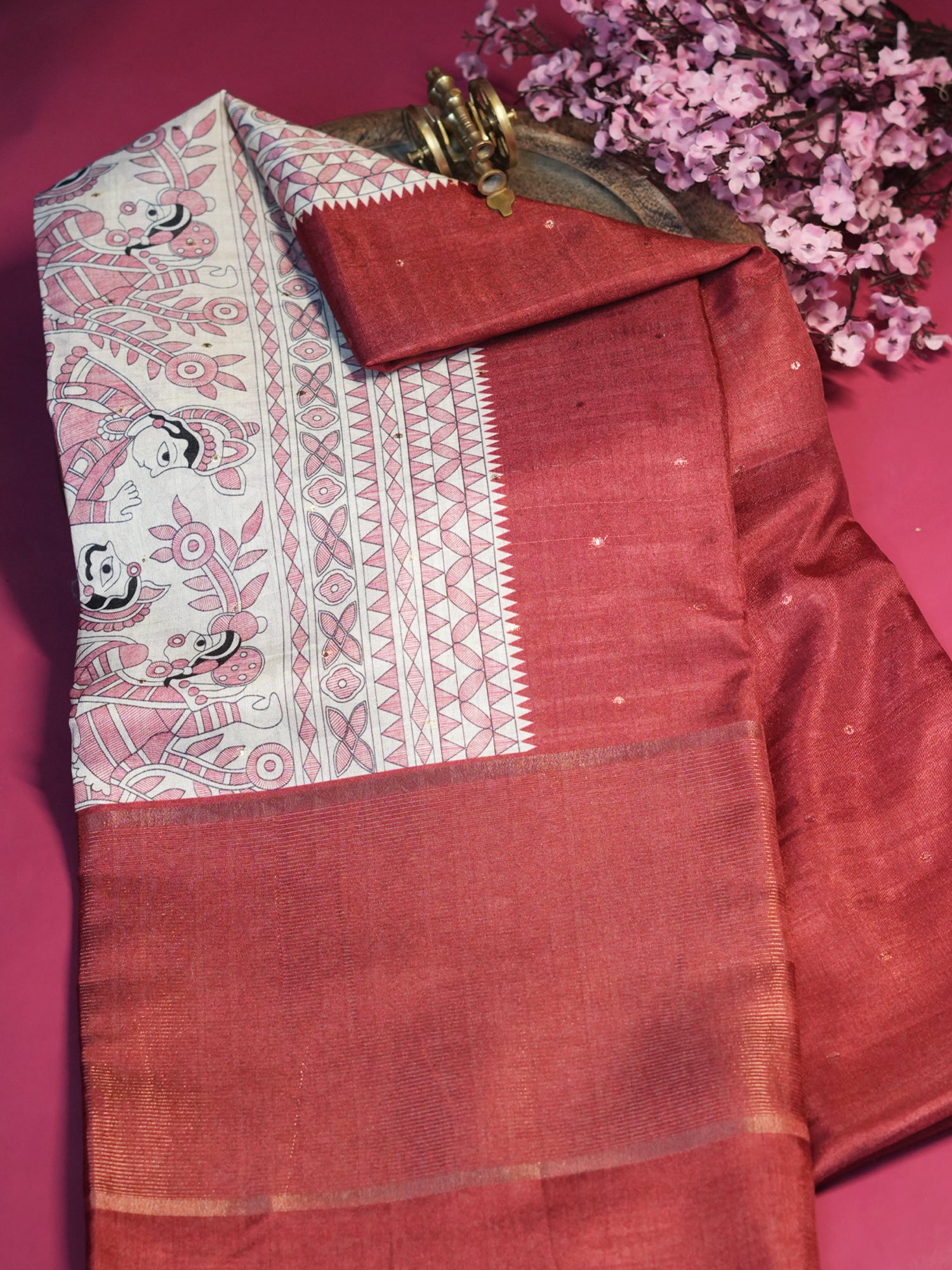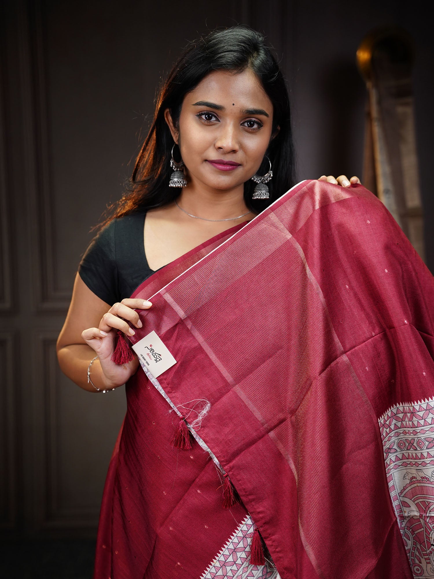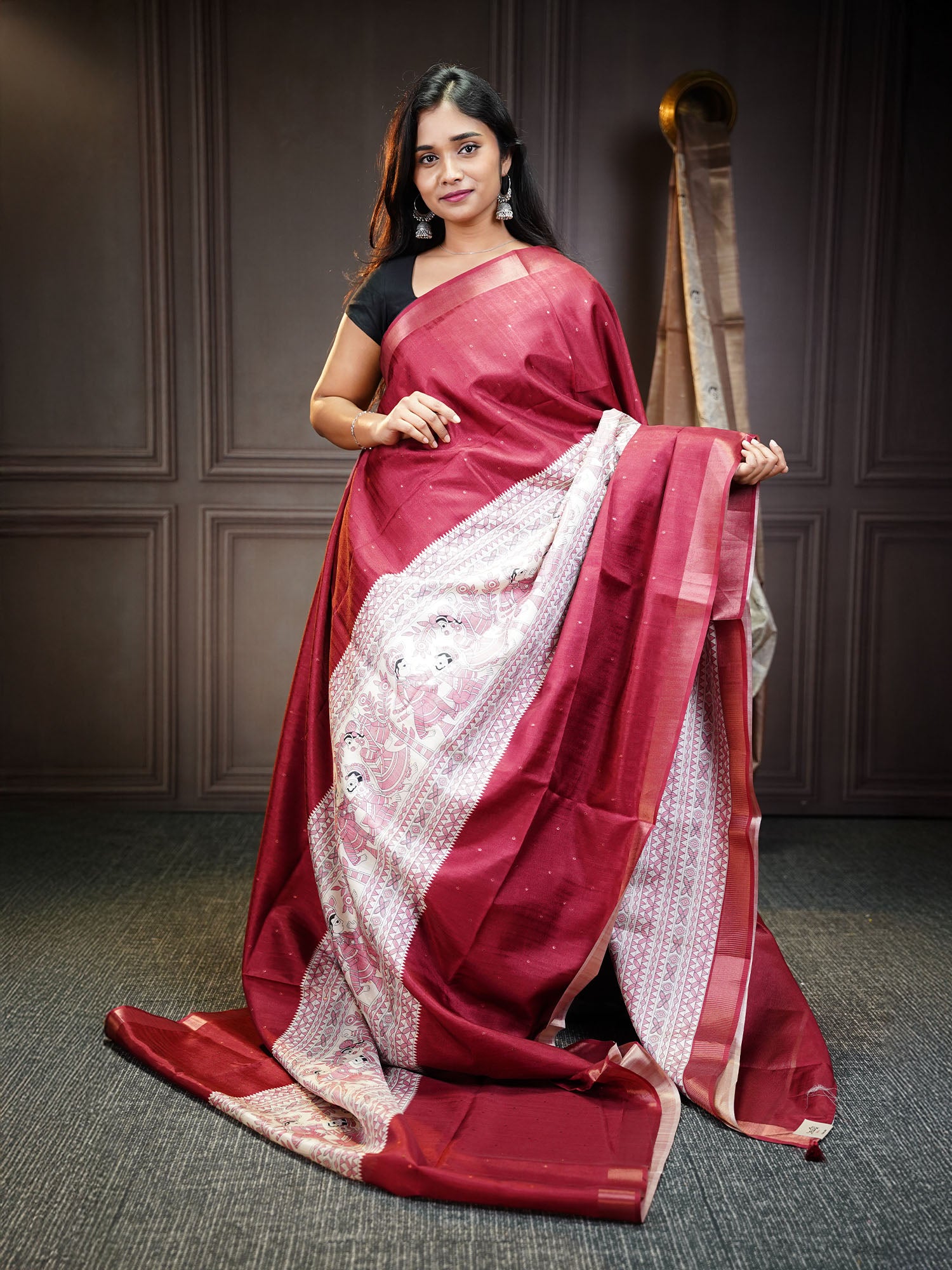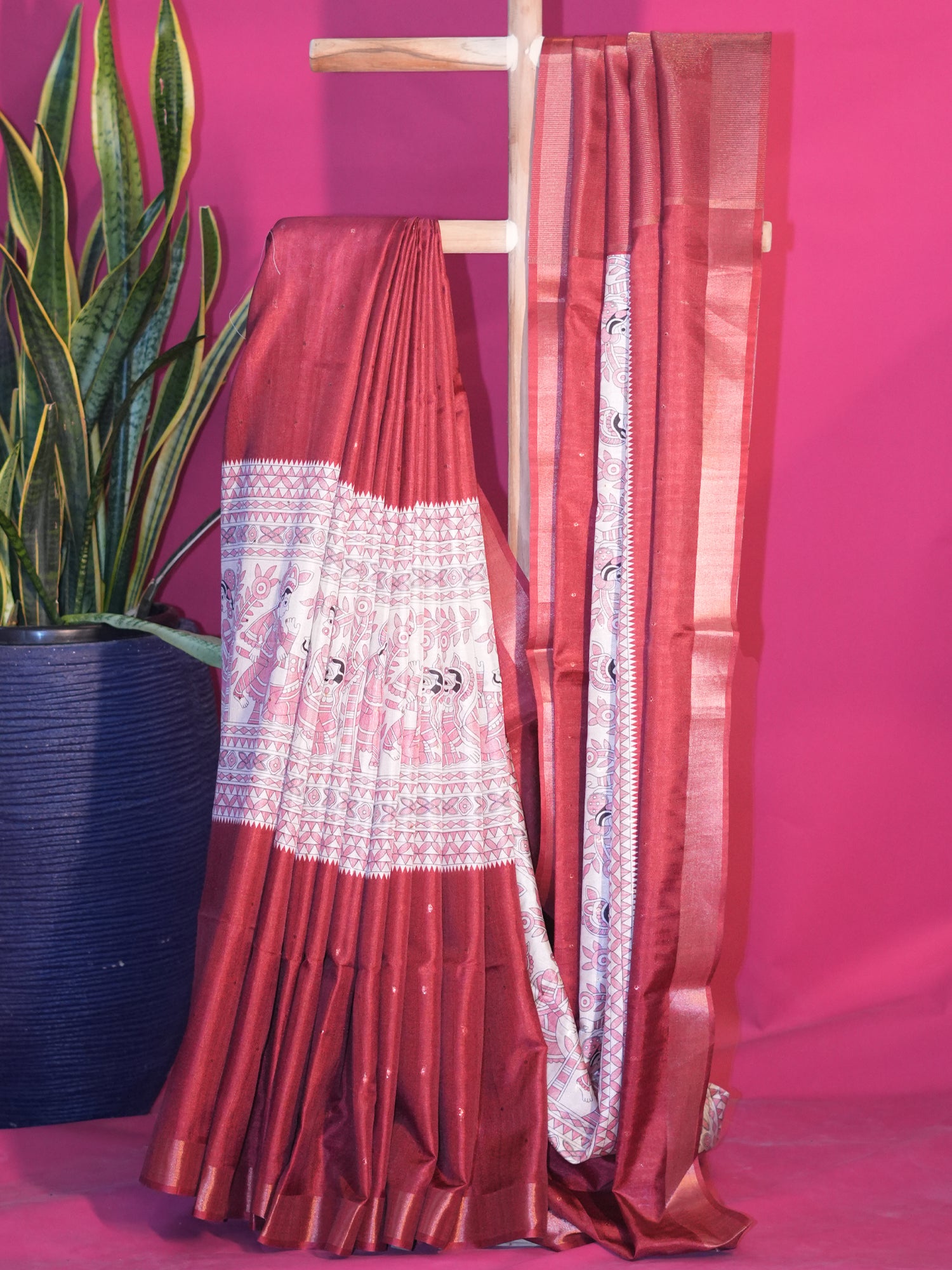 Tussar silk saree with madhubani print zari border - Maroon Drape yourself in timeless elegance with this stunning tussar silk saree, where traditional craftsmanship meets artistic flair. The rich maroon hue provides a luxurious canvas for intricate madhubani prints that dance across the fabric, telling stories of heritage and artistry. A gleaming zari border frames the piece beautifully, adding that perfect touch of shimmer for both everyday celebrations and special occasions. Soft, breathable tussar silk ensures comfort without compromising on grace, making this saree a versatile addition to your ethnic wardrobe.