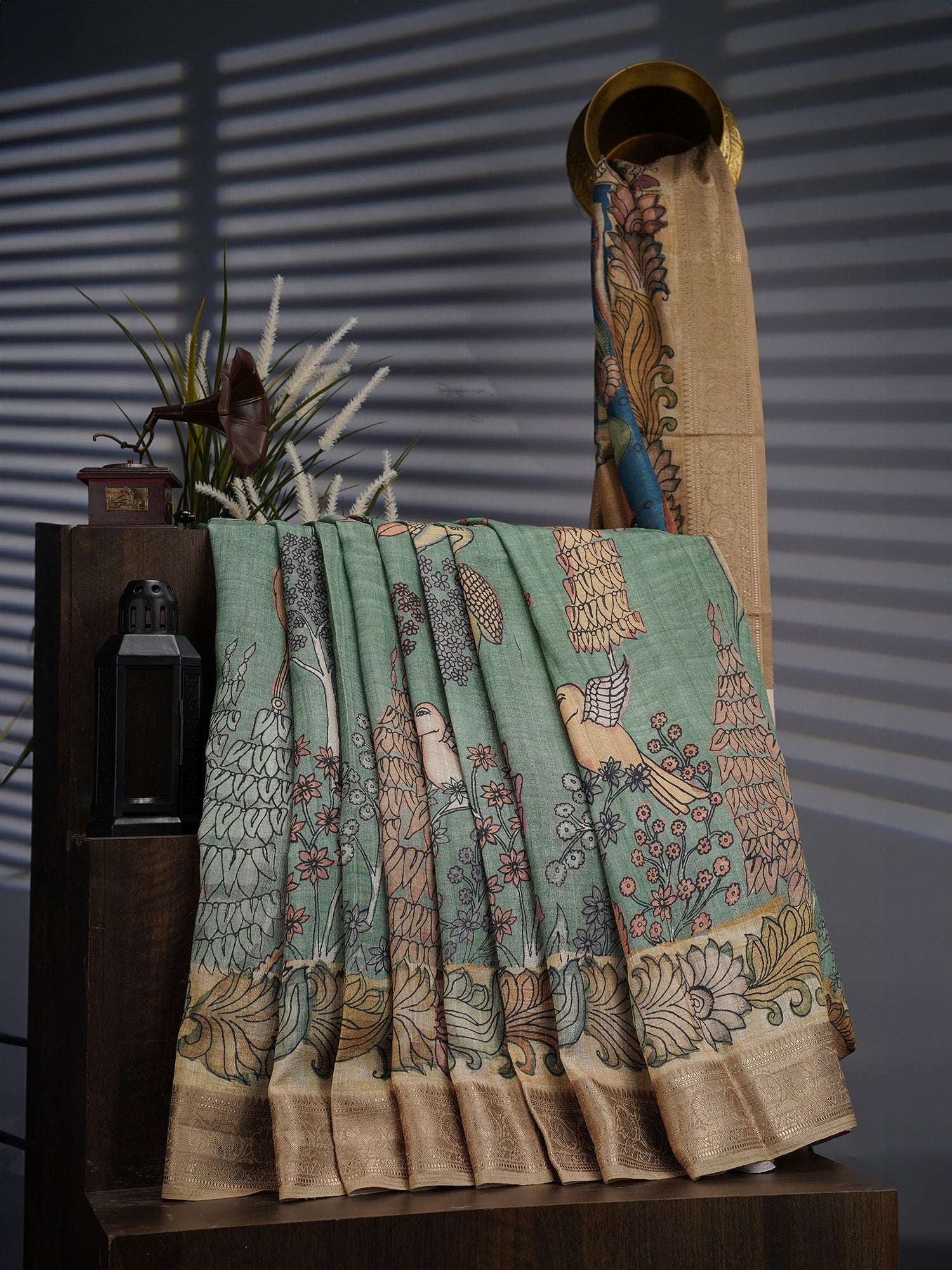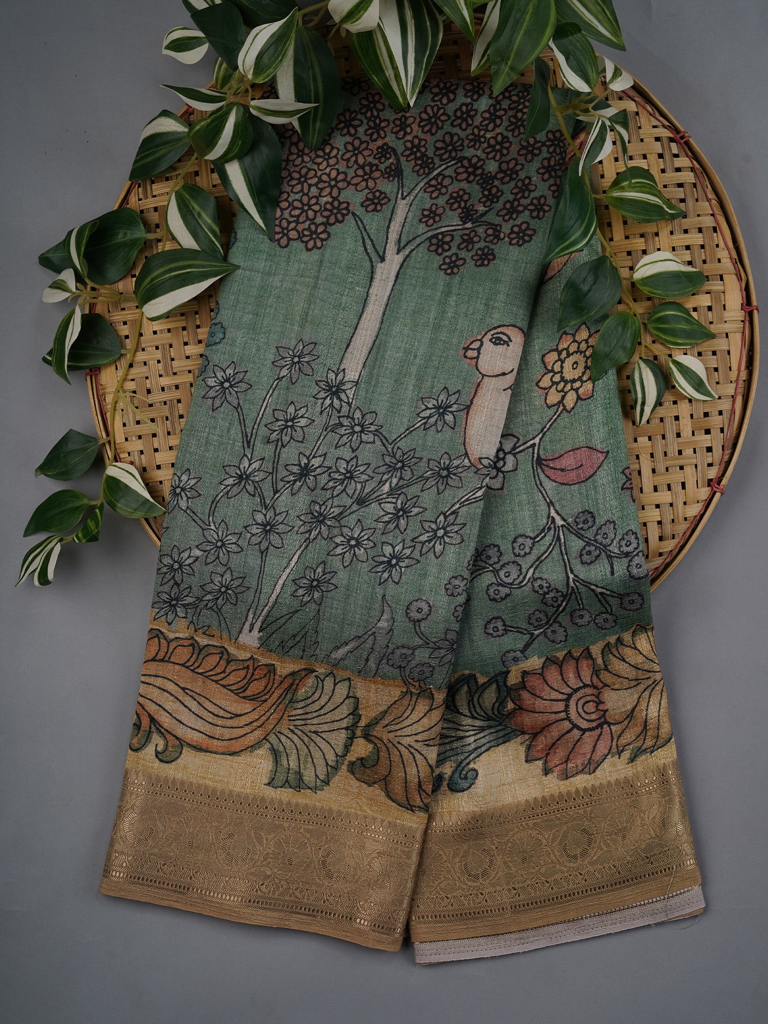 Discover the magic of hand-painted artistry with this stunning Tusser Kalamkari saree in soothing sage green. Each piece tells a story through intricate Kalamkari designs, where traditional brush strokes dance across natural tusser silk. The rich Kanchi border adds a touch of golden elegance, perfectly framing the soft, earthy hue. Lightweight and breathable, this saree is your go-to for celebrations, casual gatherings, or whenever you want to feel effortlessly graceful. Embrace timeless craftsmanship with a modern twist!
