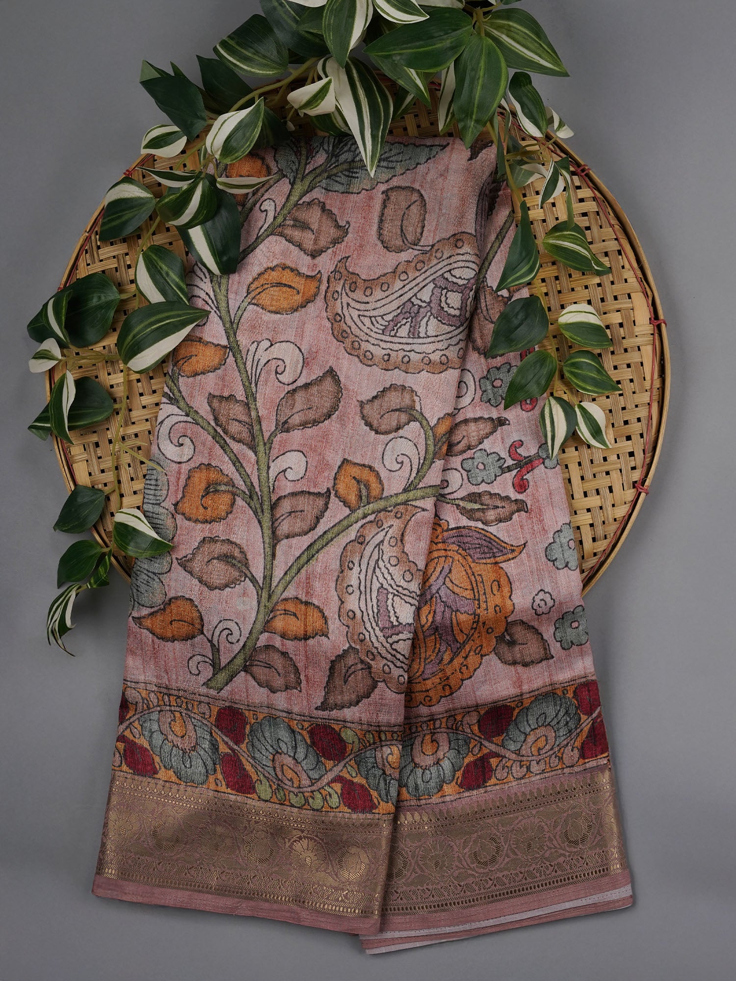 Tusser Saree Kalamkari With Kanchi Border - Onion Pink