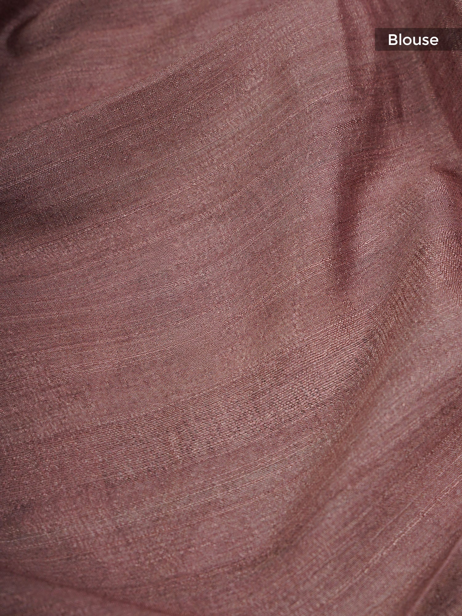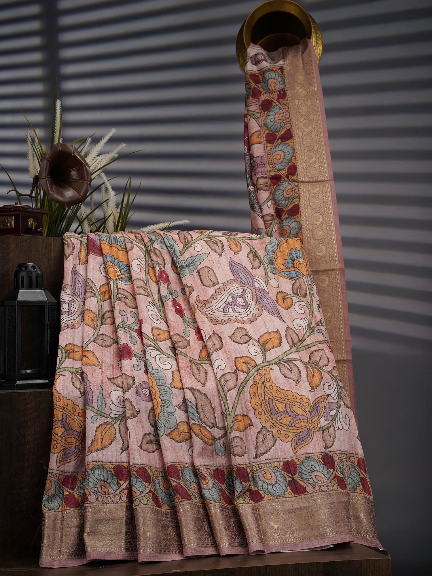 Tusser silk meets timeless artistry in this stunning Kalamkari saree, where hand-painted motifs dance across soft onion pink fabric. The...