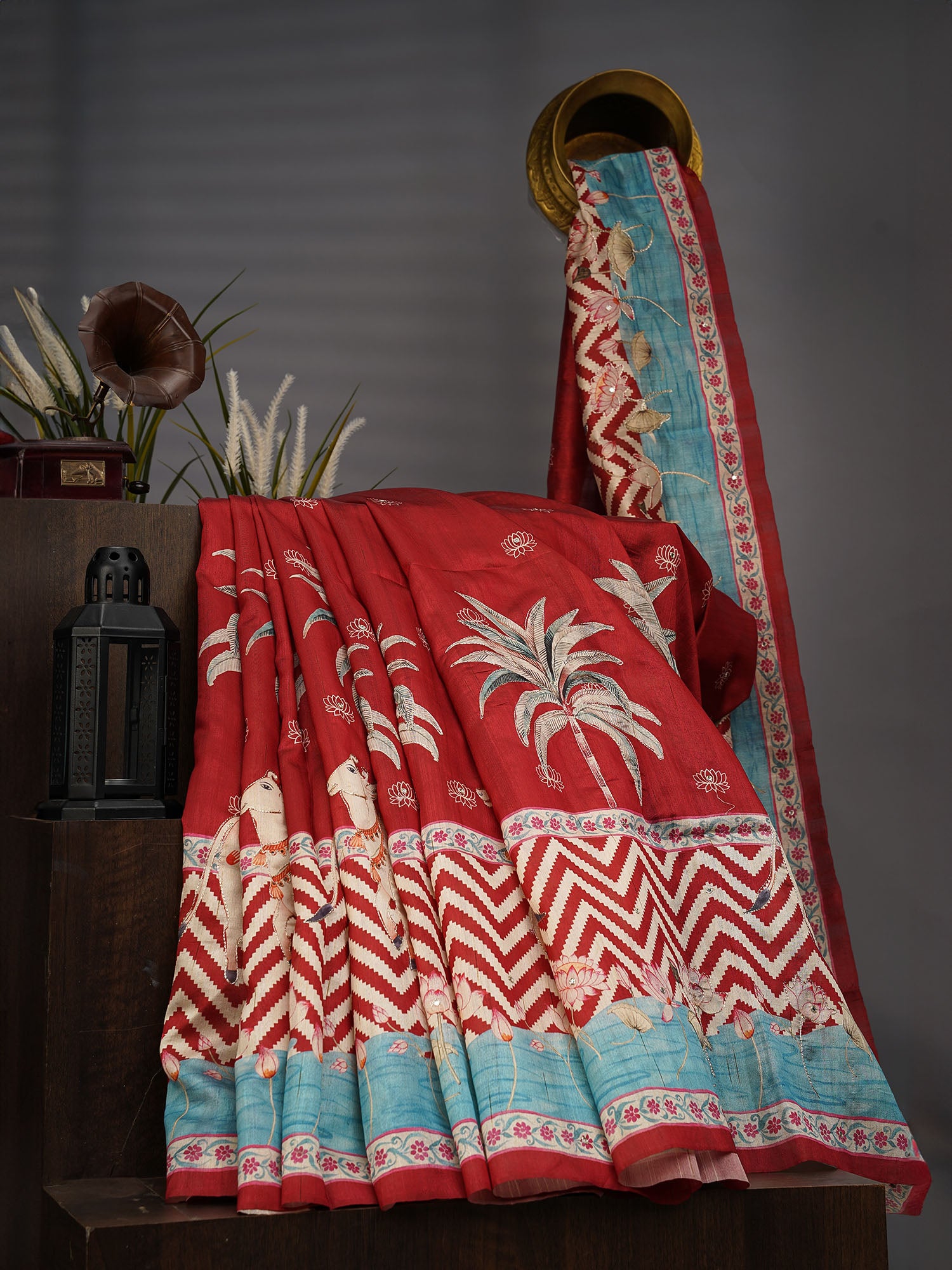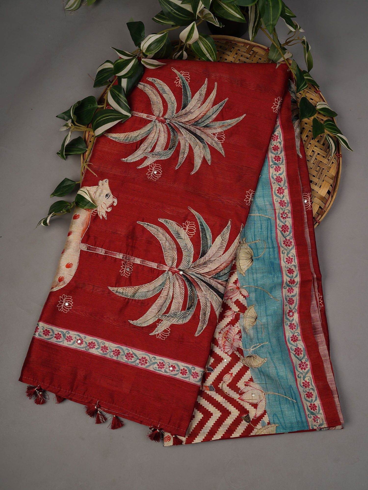Tusser silk sarees are celebrated for their natural texture and lustrous appeal, and this maroon variant exemplifies traditional craftsmanship at its finest. The allover mirror work creates a mesmerizing sparkle across the fabric, while intricate ari embroidery adds dimensional detail and sophistication. The rich maroon hue offers versatility for both festive occasions and formal gatherings, complementing a range of skin tones beautifully. Tusser's inherent durability ensures this piece remains a cherished addition to your collection for years. Perfect for those who appreciate authentic handcrafted textiles with timeless elegance.