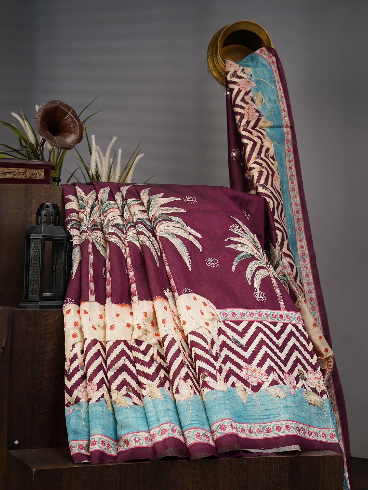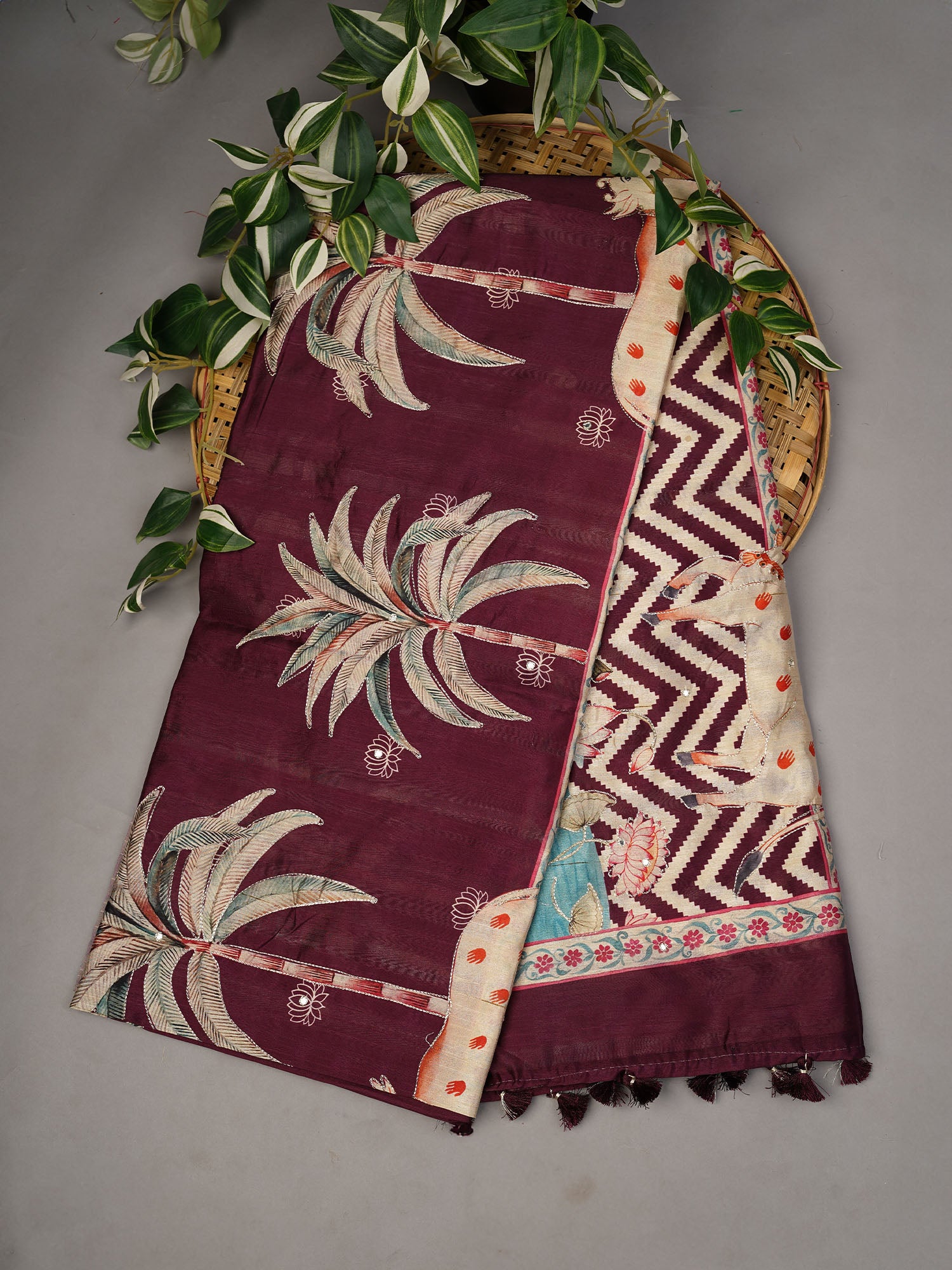 Tusser silk meets traditional craftsmanship in this exquisite saree, where intricate ari embroidery adorns the entire fabric. The lustrous tusser weave provides a natural sheen and comfortable drape, while meticulously placed mirrors catch light with every movement. Each stitch reflects generations of artisanal expertise, creating a piece that seamlessly transitions from celebrations to special occasions. The combination of tusser's durability with delicate mirror work ensures both elegance and longevity, making this saree a timeless addition to your collection.
