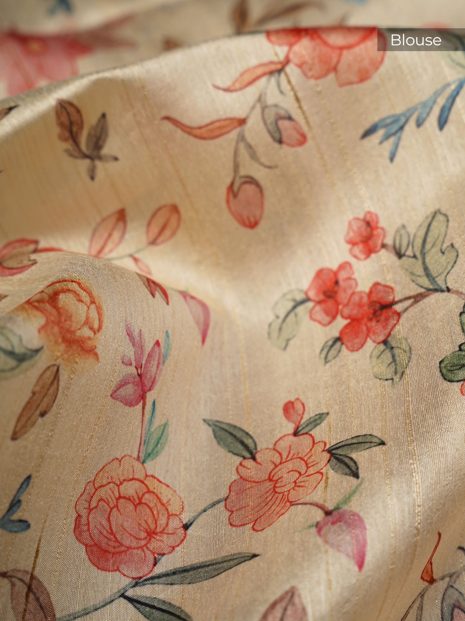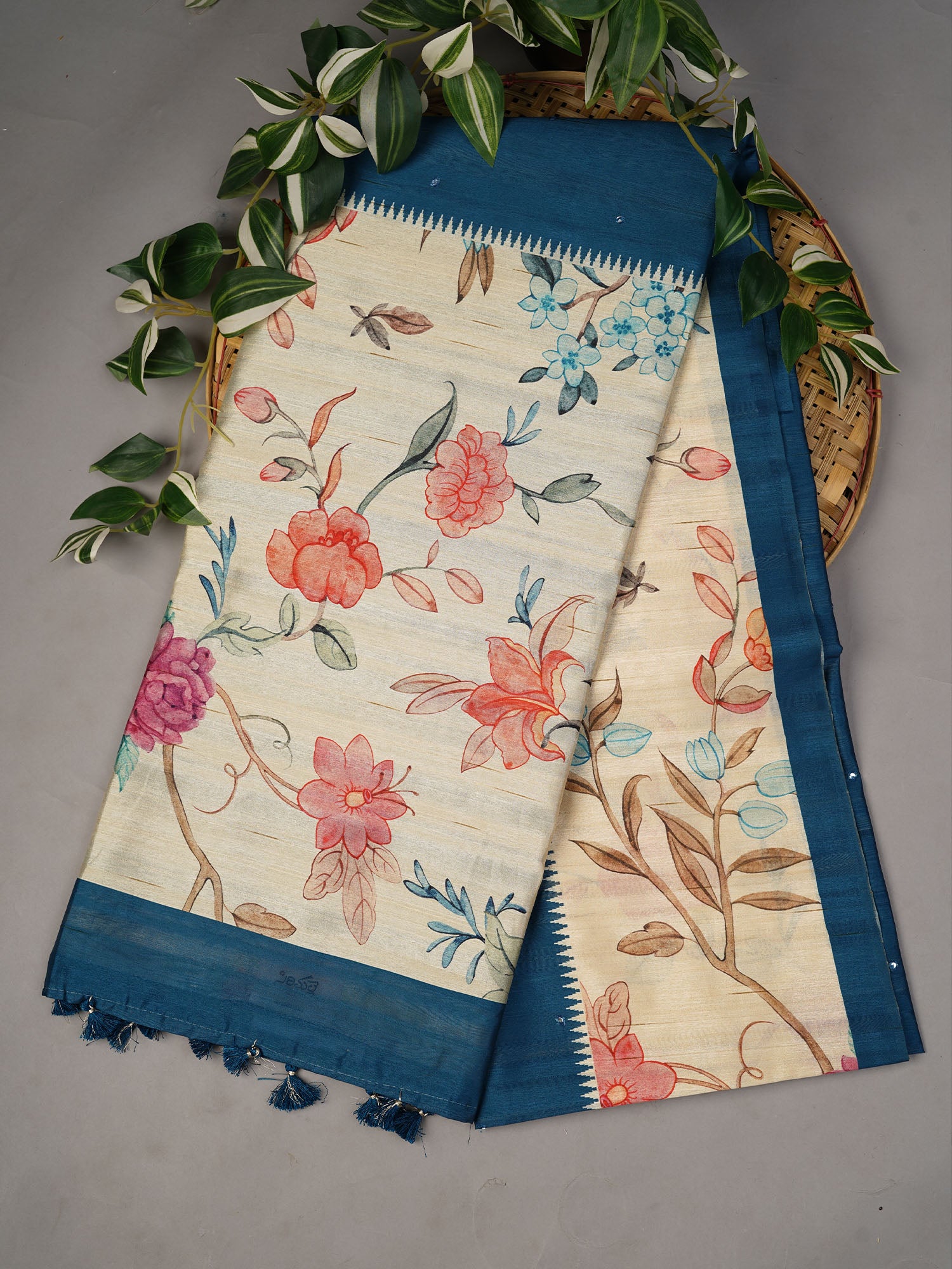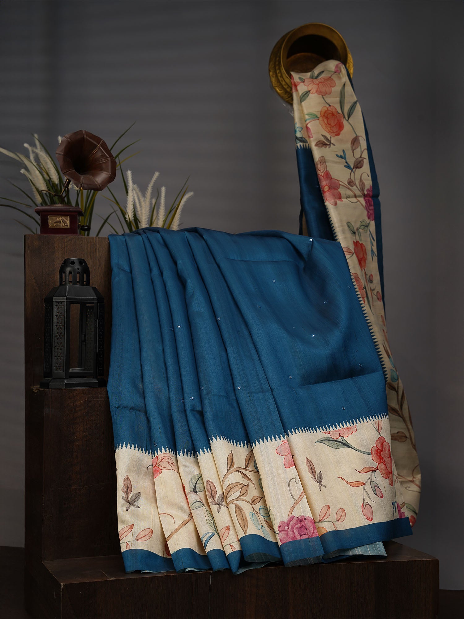 Tusser silk meets contemporary design in this striking saree, featuring an allover mirror embellishment paired with vibrant digital prints. The natural texture of tusser silk provides a subtle sheen and breathable comfort, while the scattered mirrors catch light beautifully with every movement. The digital print technique ensures crisp, detailed patterns that resist fading. Perfect for festive occasions and celebrations, this saree balances traditional craftsmanship with modern aesthetics. Versatile enough for both formal events and semi-formal gatherings, it's a sophisticated choice for the discerning wearer.