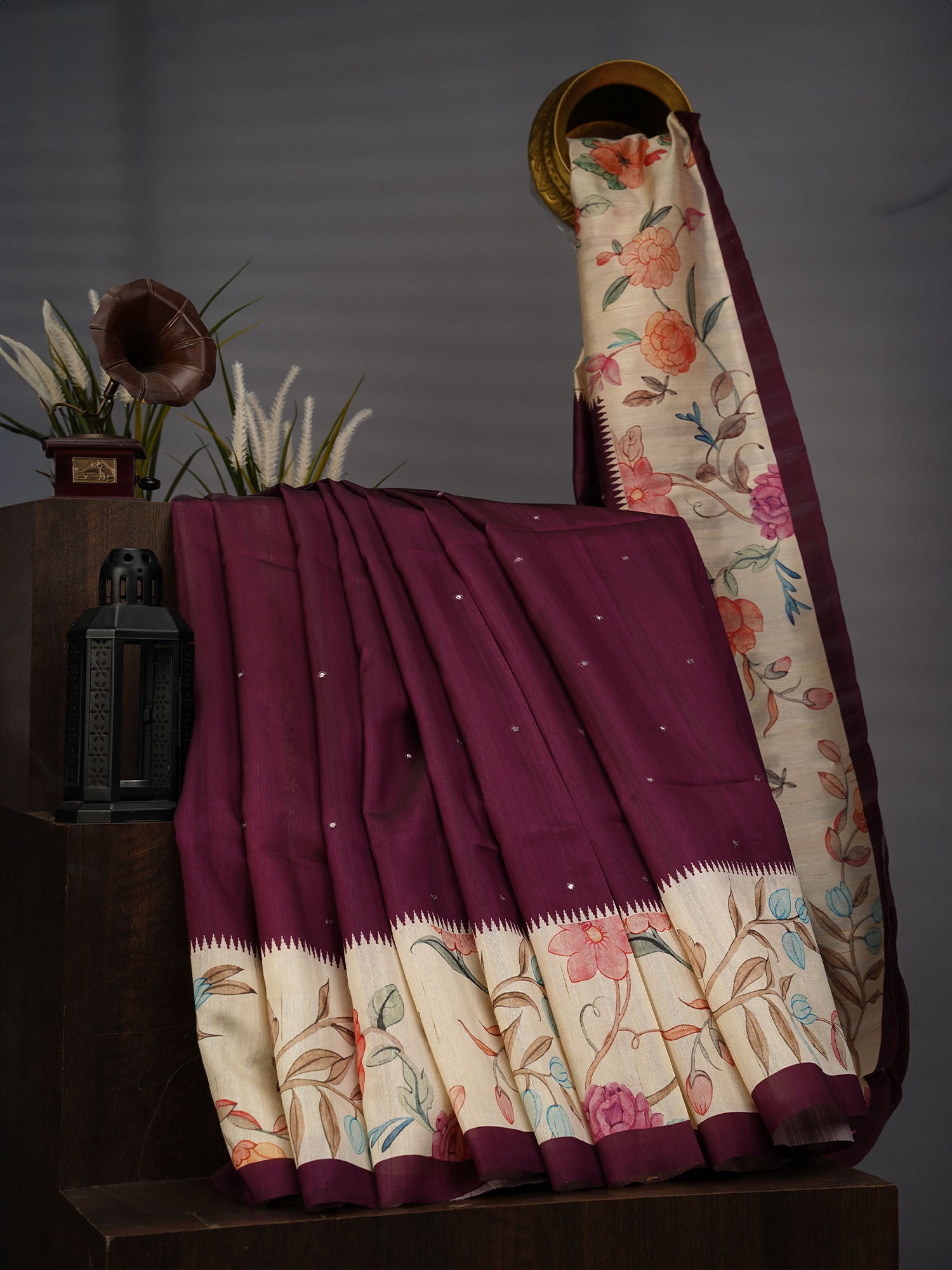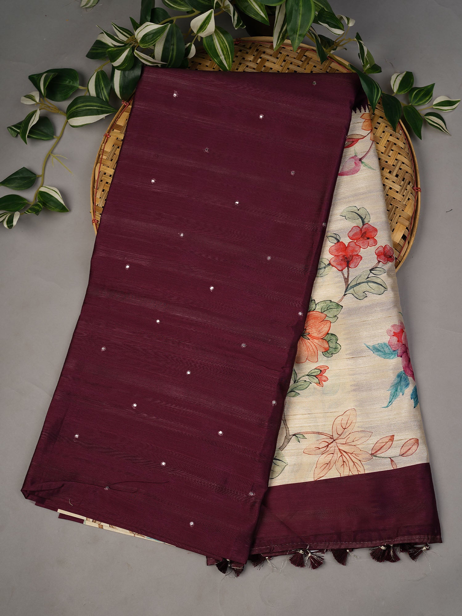 Tusser silk meets contemporary design in this striking purple saree, featuring intricate mirror work scattered across the fabric for a luminous, dimensional effect. The allover mirror embellishments catch light beautifully, creating movement and depth with every wear. Complementing the traditional craftsmanship, digital print detailing adds modern sophistication and visual interest to the weave. The natural texture of tusser silk—known for its subtle sheen and breathable comfort—makes this piece ideal for both festive occasions and refined everyday elegance. A versatile choice that seamlessly blends heritage techniques with contemporary aesthetics.