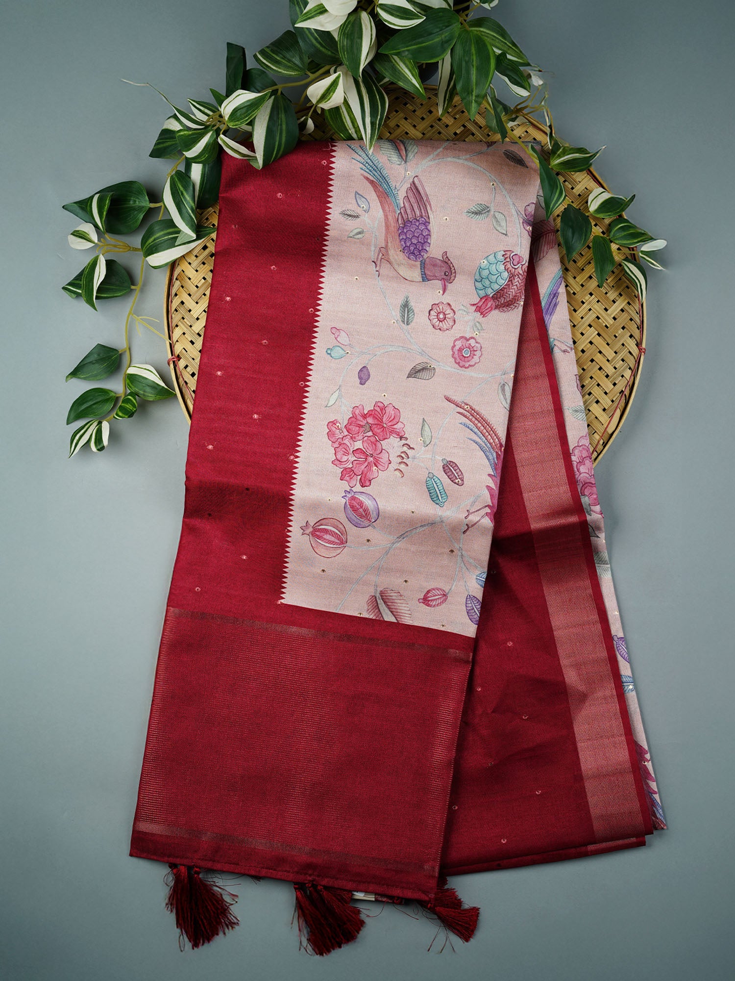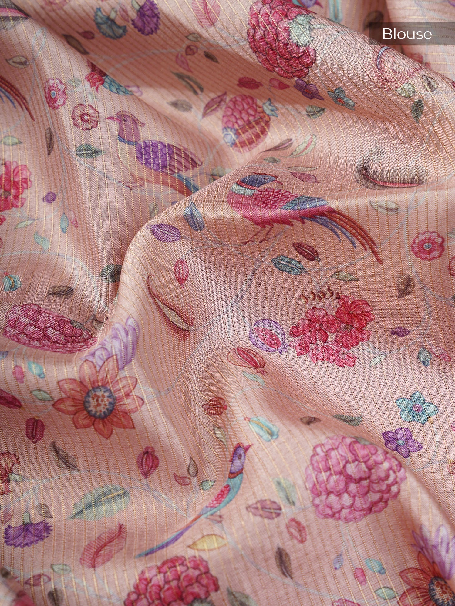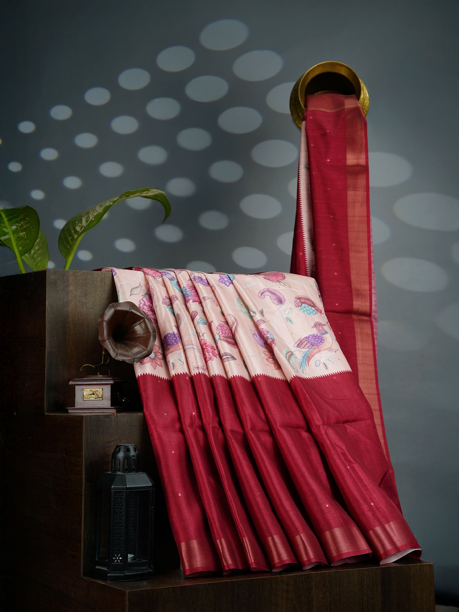Tusser Silk Saree Floral Print with Contrast Border- Peach