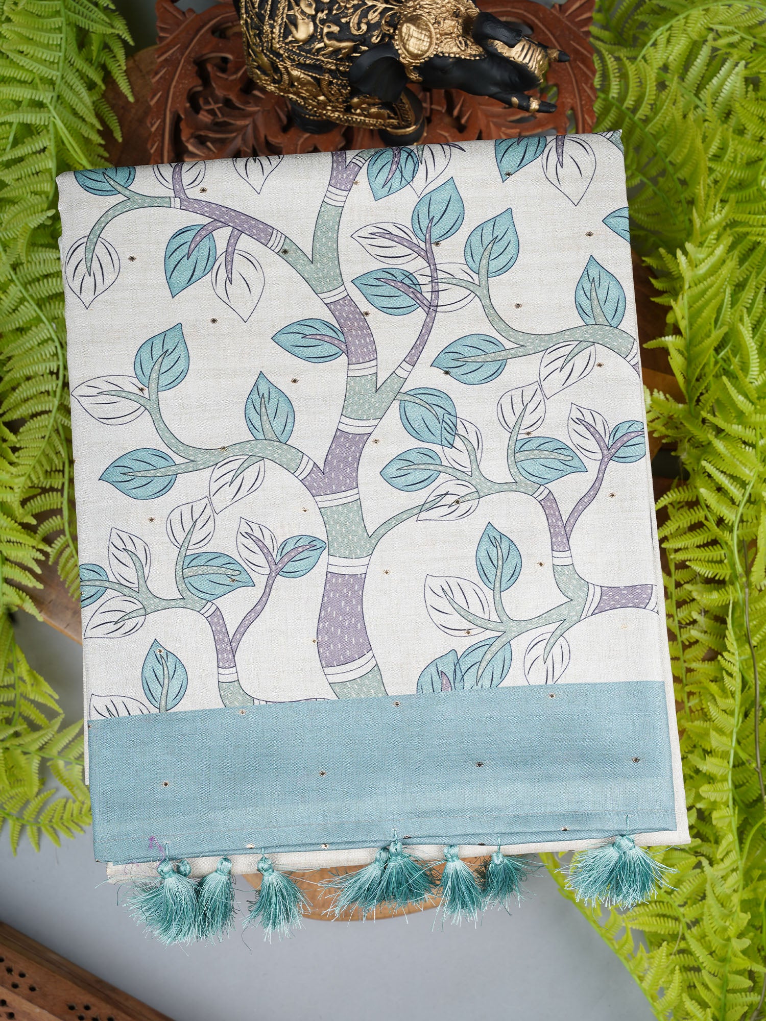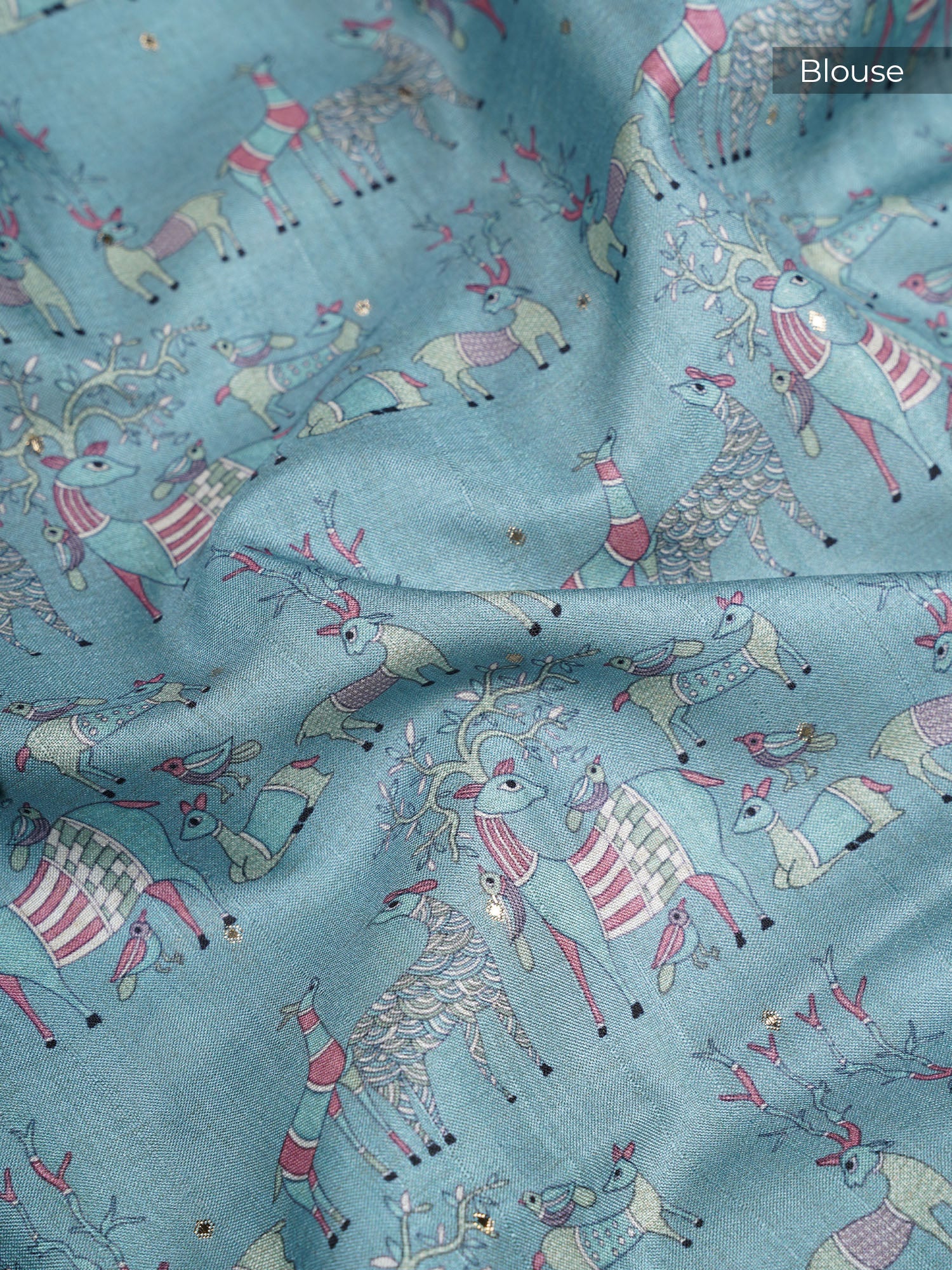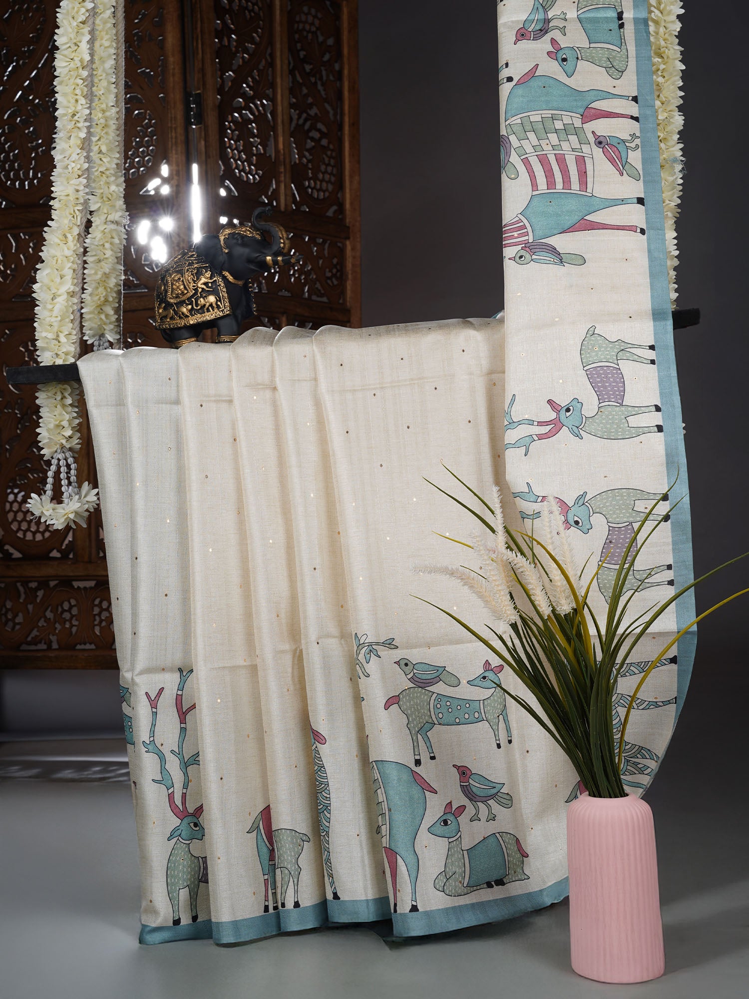 Unleash your wild side with this stunning tusser silk saree featuring an all-over animal print in rich cream and green...