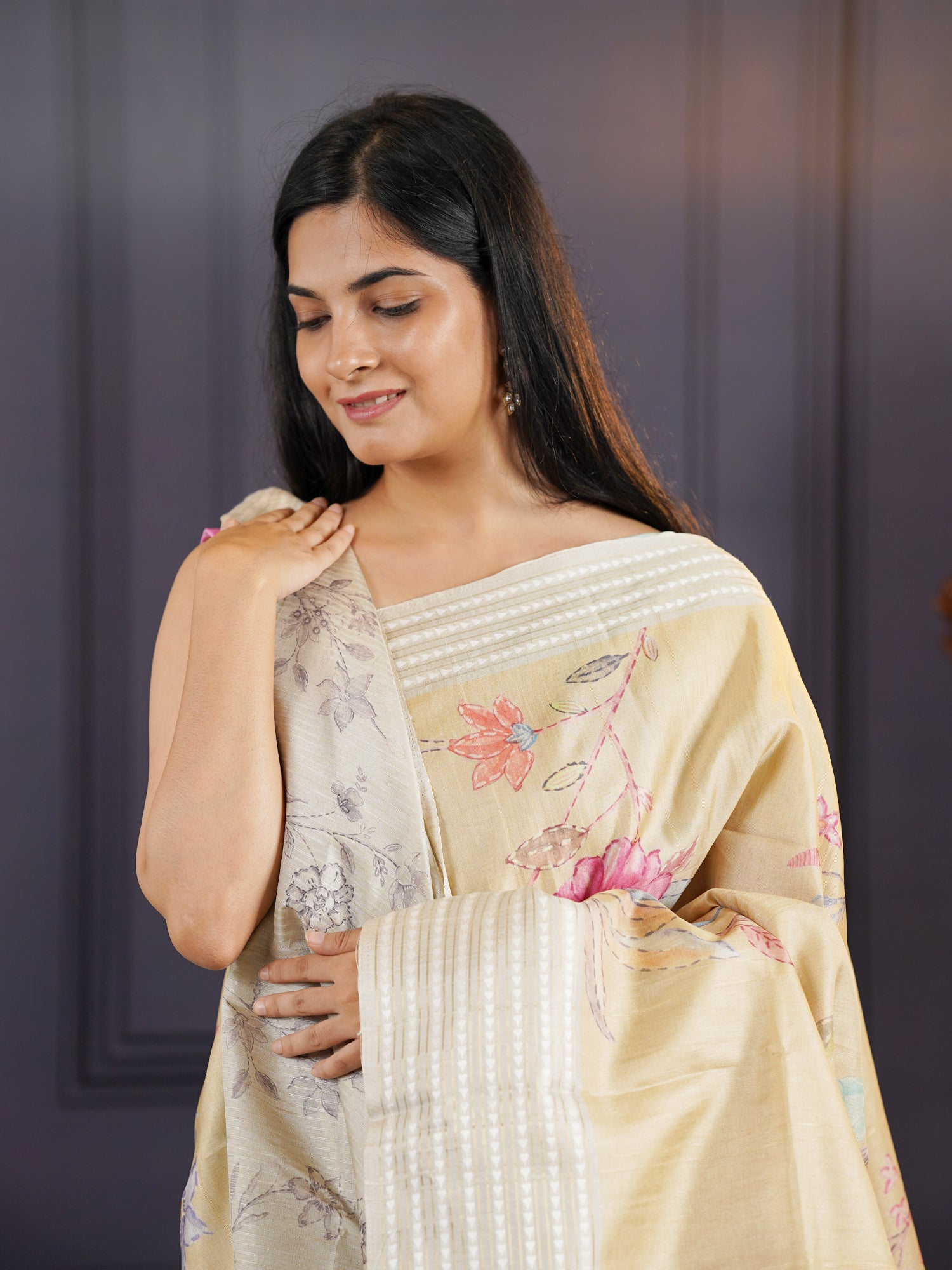 Discover understated elegance in this gorgeous Tusser Silk Saree rendered in a warm tan hue. Woven from luxurious tusser silk, it delivers a naturally lustrous finish and comfortable, flowing drape that flatters every silhouette. Vibrant digital floral motifs dance across the fabric, infusing traditional saree styling with a playful, modern edge. Ideal for festive occasions, family gatherings, or whenever you want to feel absolutely radiant, this versatile piece pairs beautifully with classic or contemporary accessories. Celebrate your unique style with a saree that honors heritage while embracing contemporary design sensibilities.