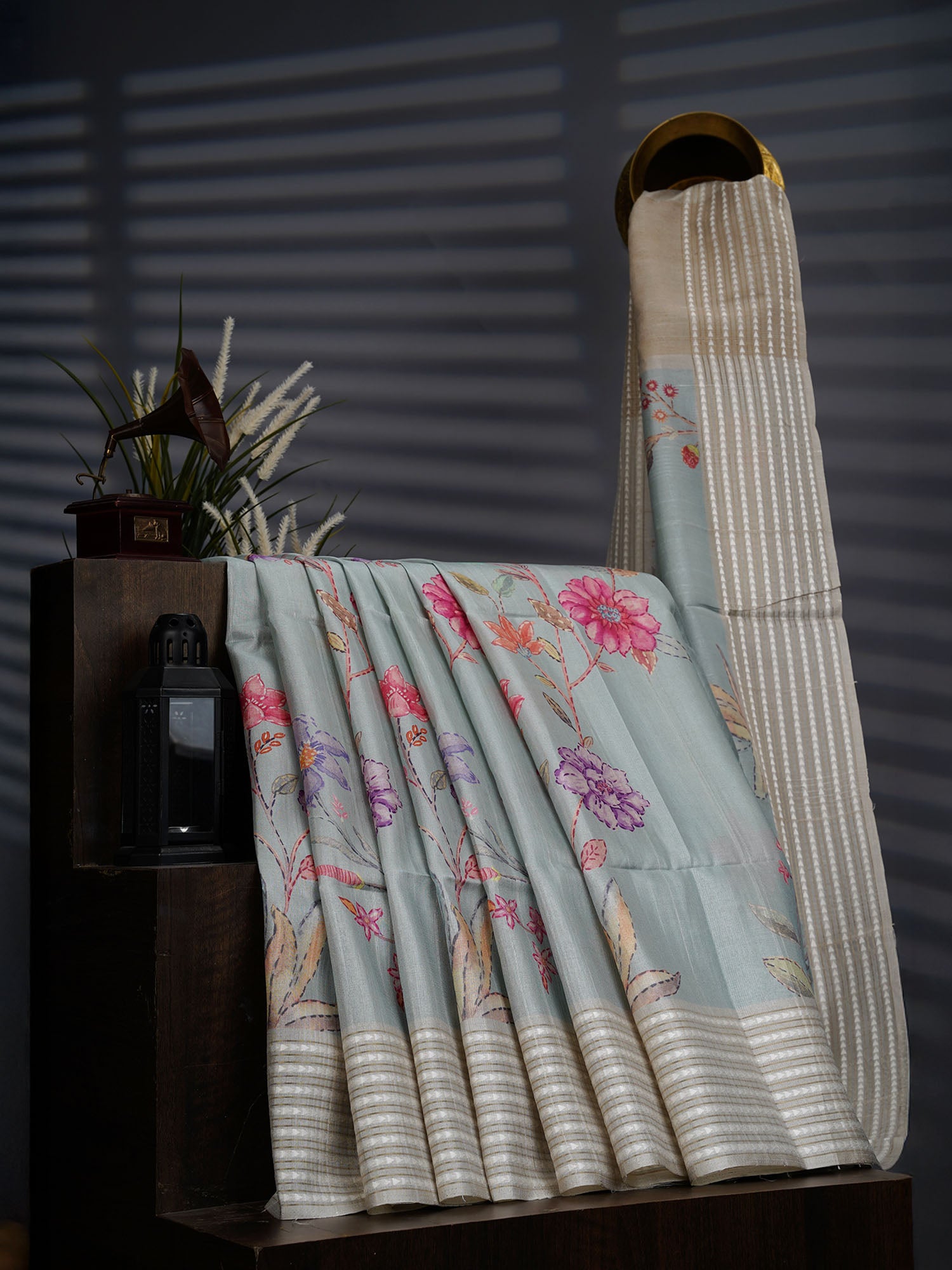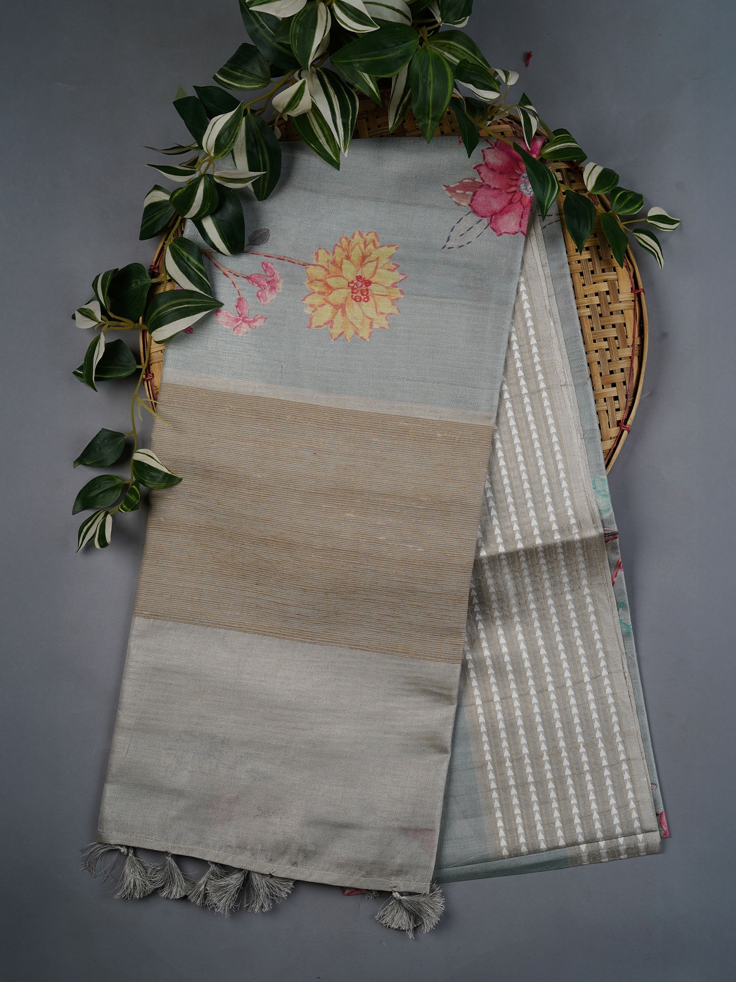 Discover the perfect blend of tradition and modern style with this stunning Tusser Silk Saree in refreshing mint blue. Adorned with vibrant digital floral prints that dance across the fabric, this saree brings a contemporary twist to timeless elegance. The natural texture of tusser silk drapes beautifully while maintaining its signature subtle sheen, making it ideal for festive occasions, celebrations, or whenever you want to turn heads. Lightweight yet luxurious, this mint beauty is your go-to piece for effortless sophistication with a playful edge.