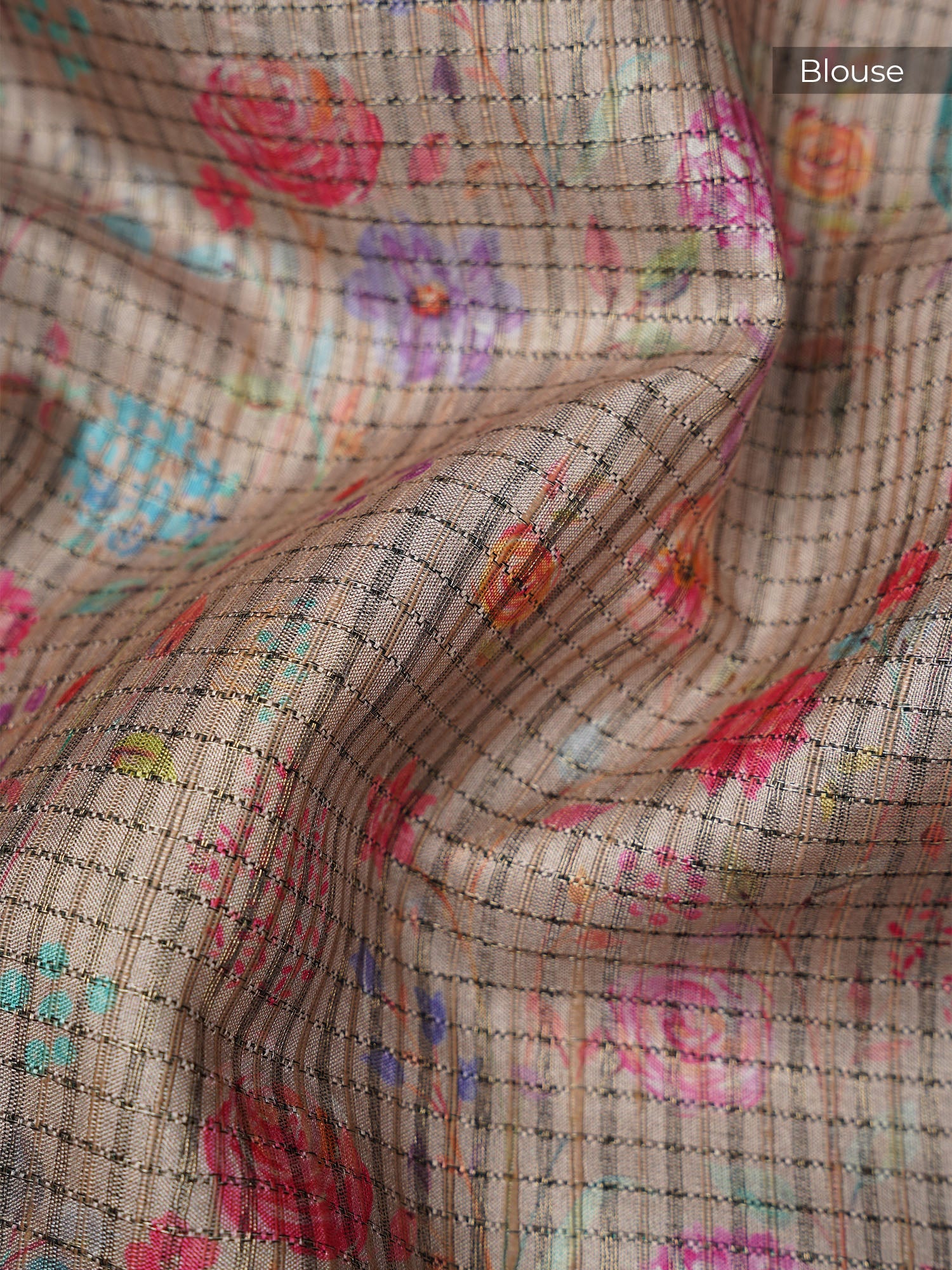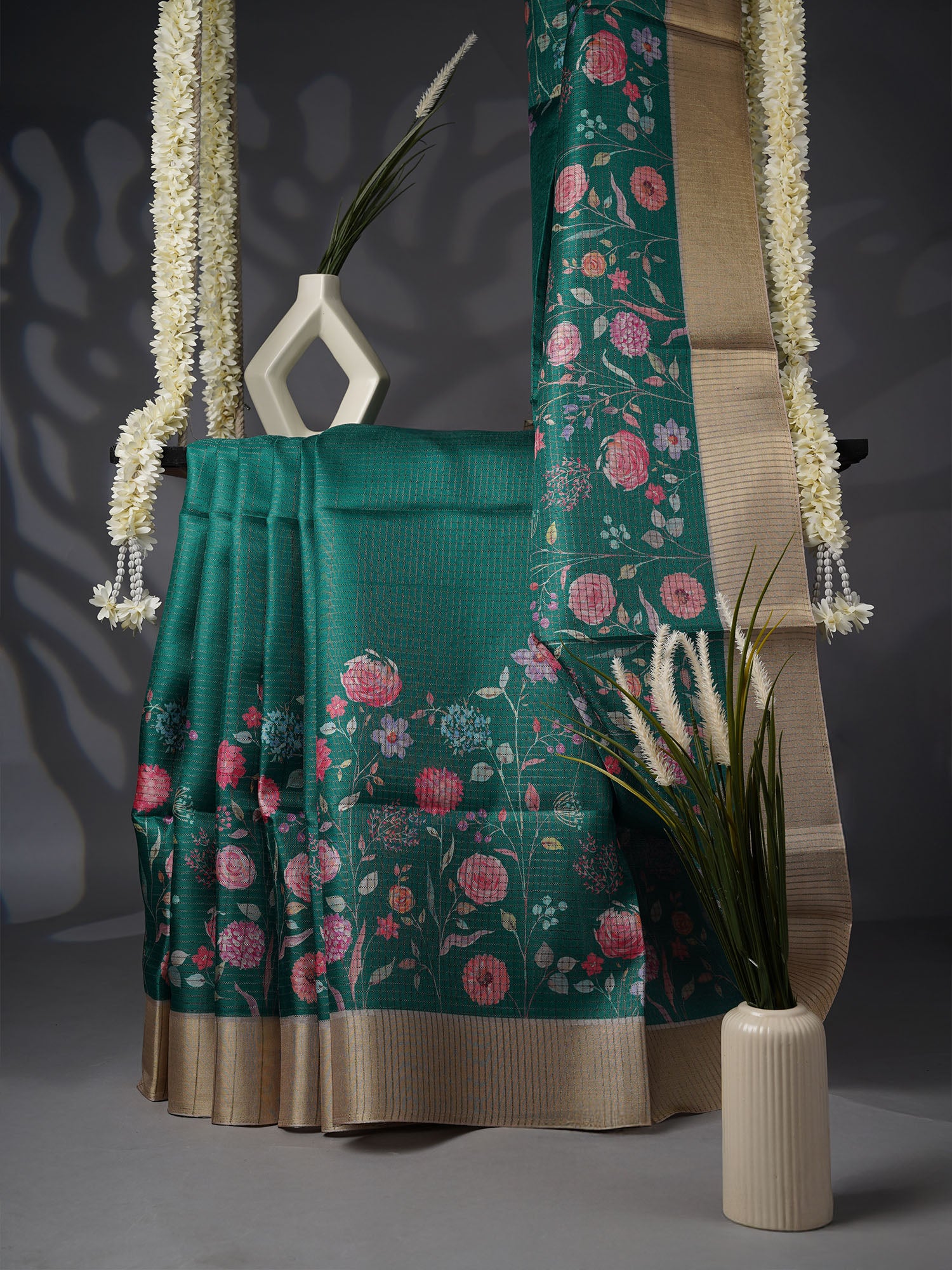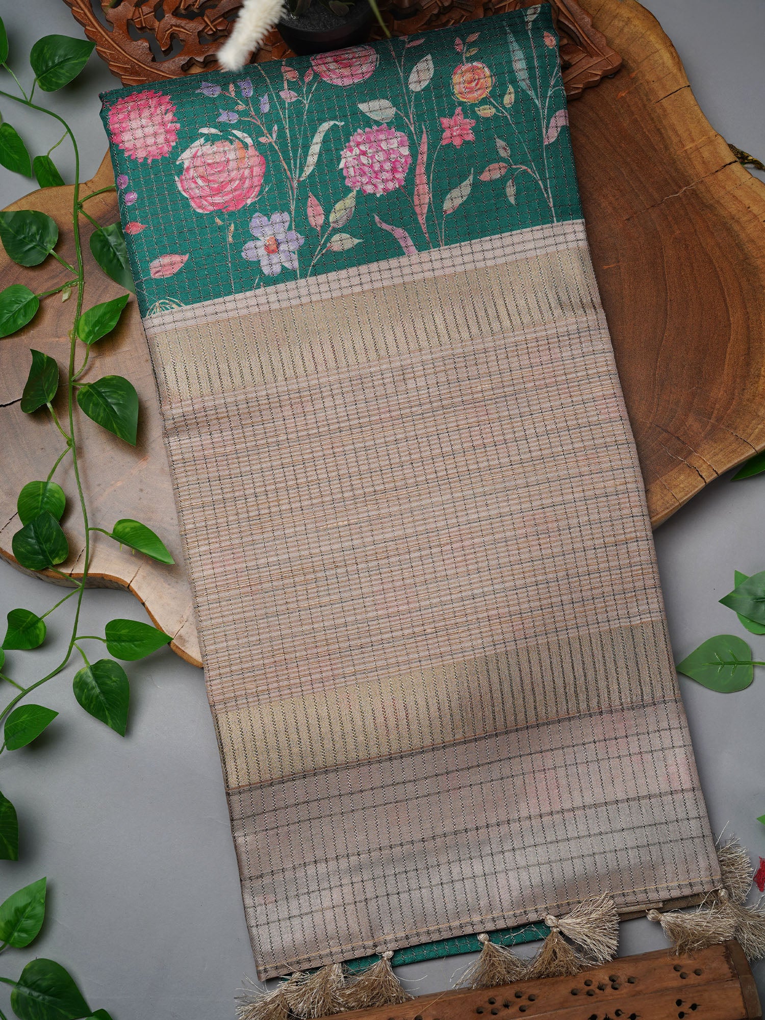 Tusser Silk Saree with Floral Print and Contrast Border- Green