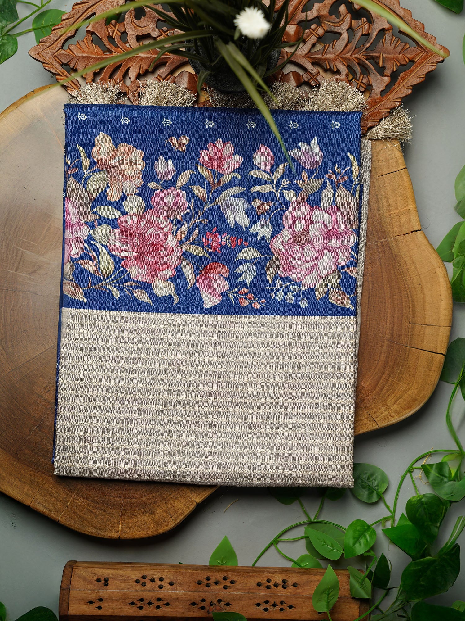 Tusser Silk Saree with Floral Print and Subtle Vertical Stripes and Small Delicate Motifs- Blue