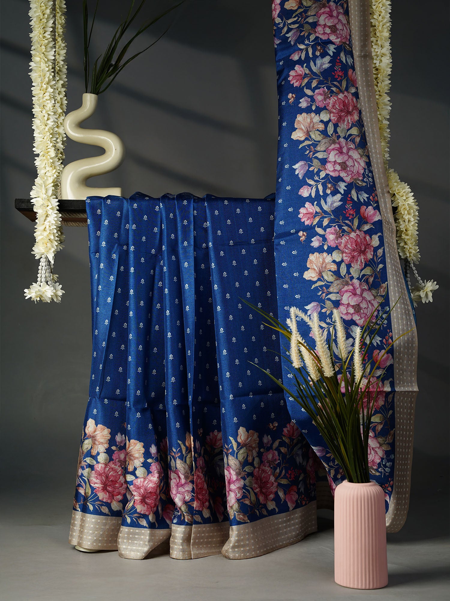 Dive into timeless elegance with this stunning tusser silk saree in serene blue. Delicate floral prints dance across the fabric,...