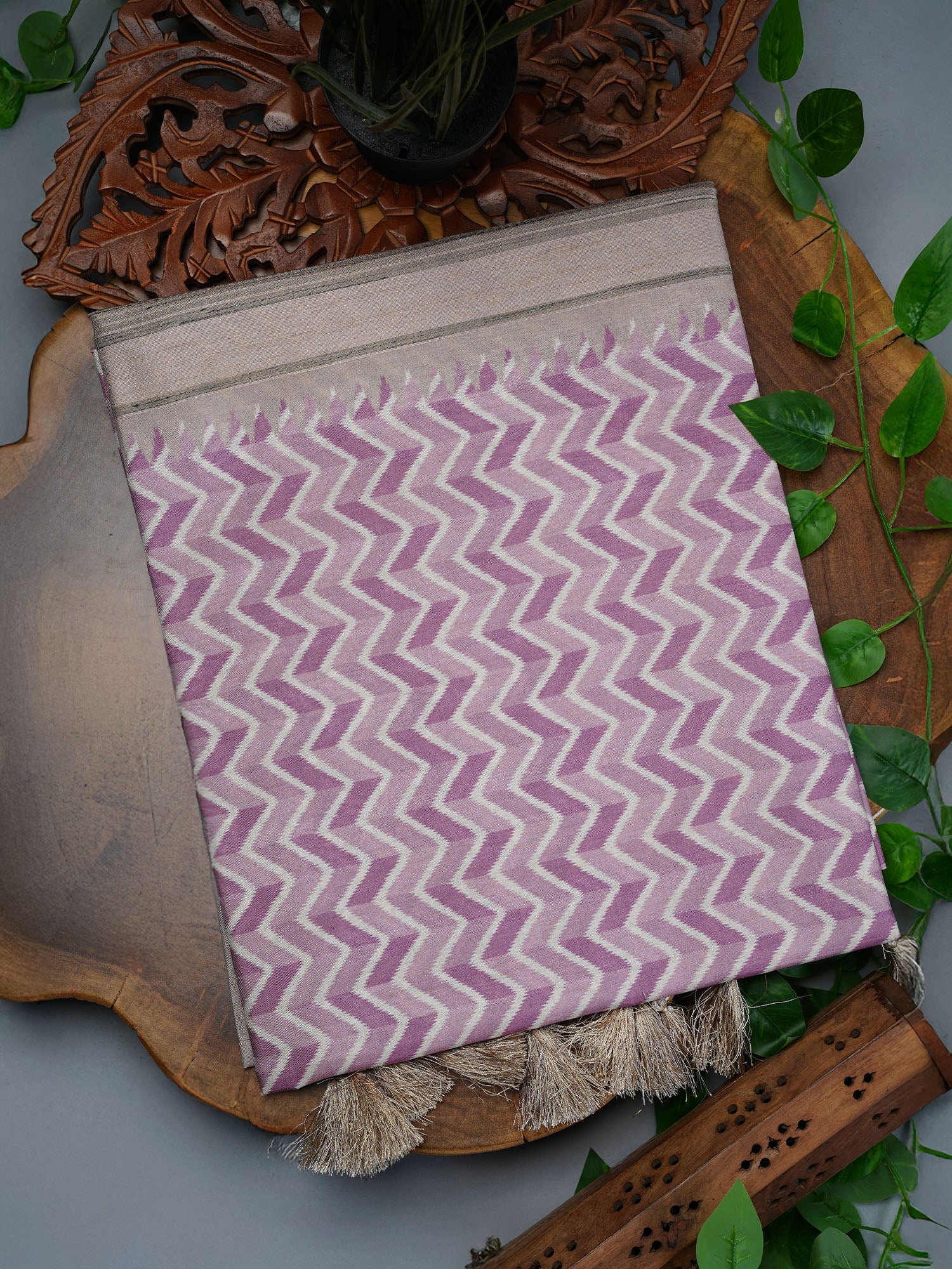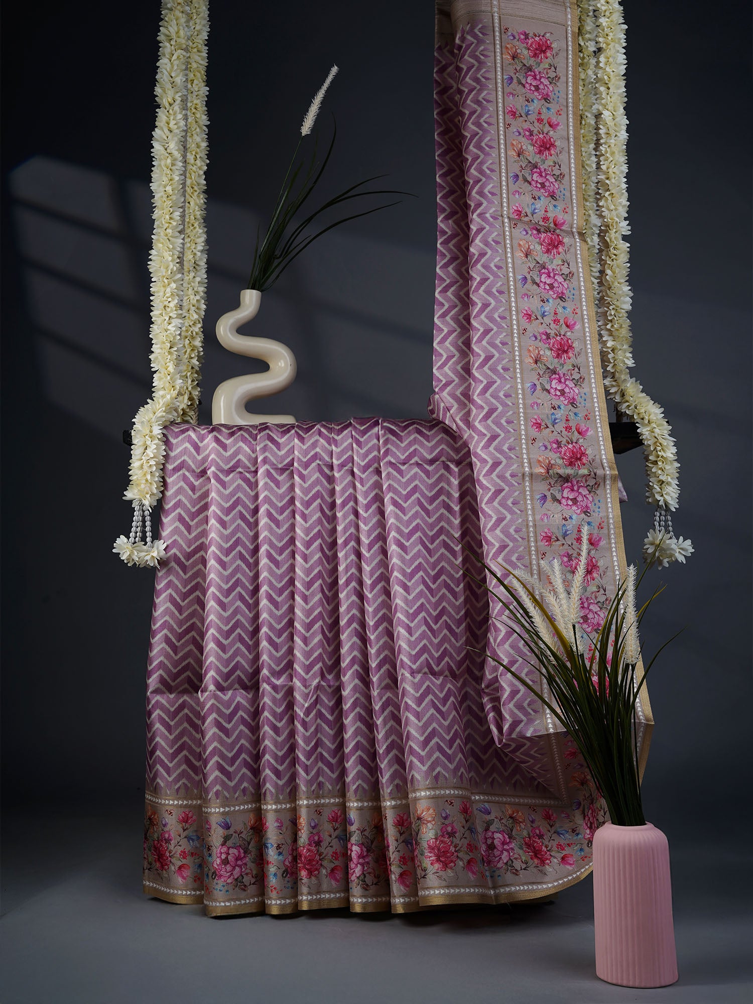 Drape yourself in understated elegance with this stunning tusser silk saree, where soft light purple meets intricate floral print borders. Tusser silk's natural texture brings a subtle sheen and breathable comfort, perfect for both festive occasions and everyday celebrations. The delicate floral detailing along the border adds a touch of botanical charm without overwhelming the serene base. Lightweight yet luxurious, this saree effortlessly transitions from day to evening wear. A timeless piece that whispers sophistication with every graceful movement.