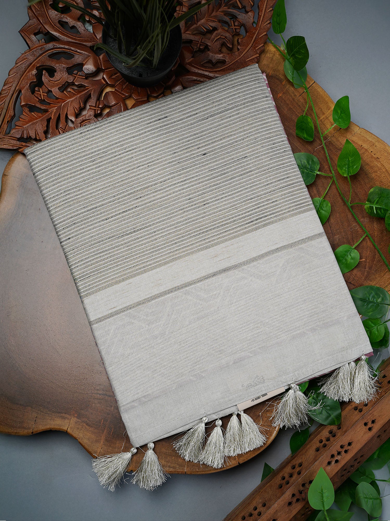 Drape yourself in understated elegance with this stunning tusser silk saree, where soft pink tones meet intricate floral print borders. Tusser silk's natural texture brings a subtle sheen and breathable comfort, perfect for both festive occasions and everyday celebrations. The delicate floral detailing along the border adds a touch of botanical charm without overwhelming the refined simplicity of the weave. Lightweight yet luxurious, this saree effortlessly transitions from day to evening, making it a versatile addition to your ethnic wardrobe.