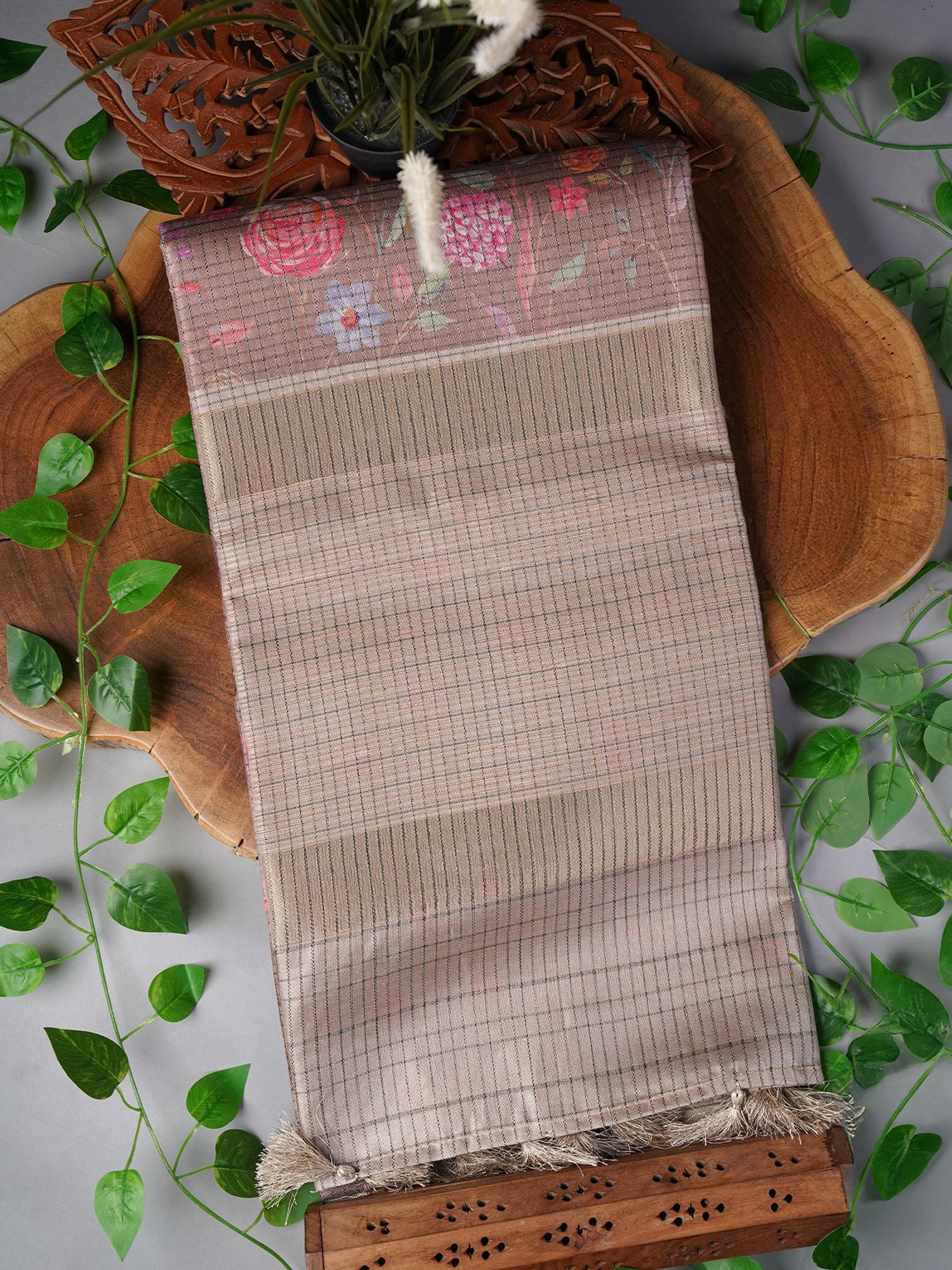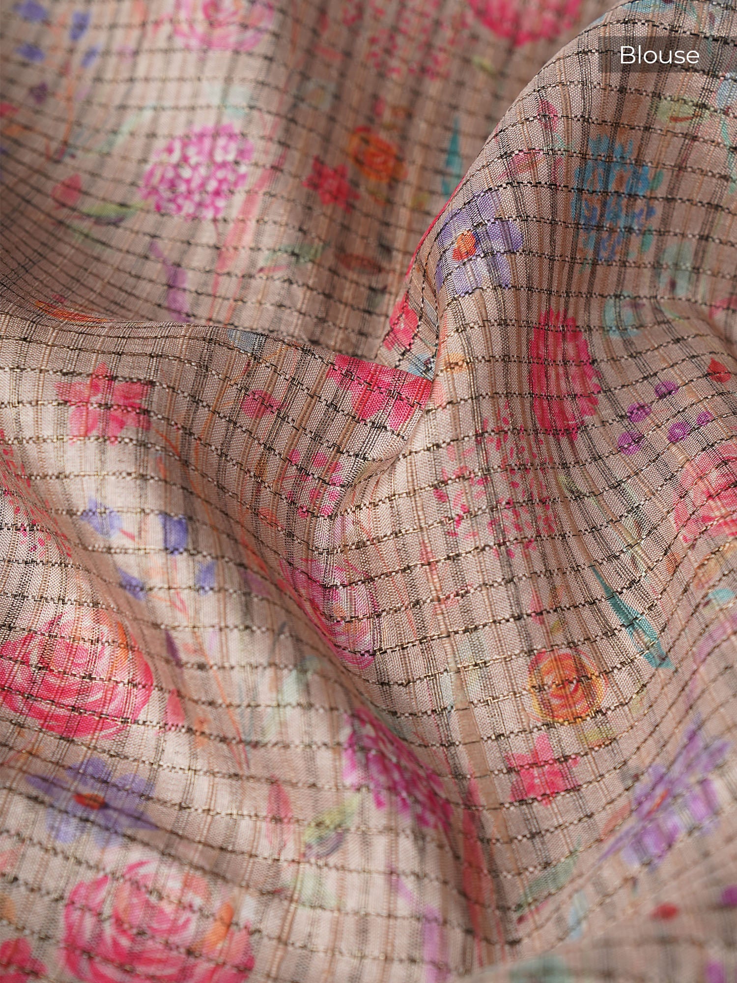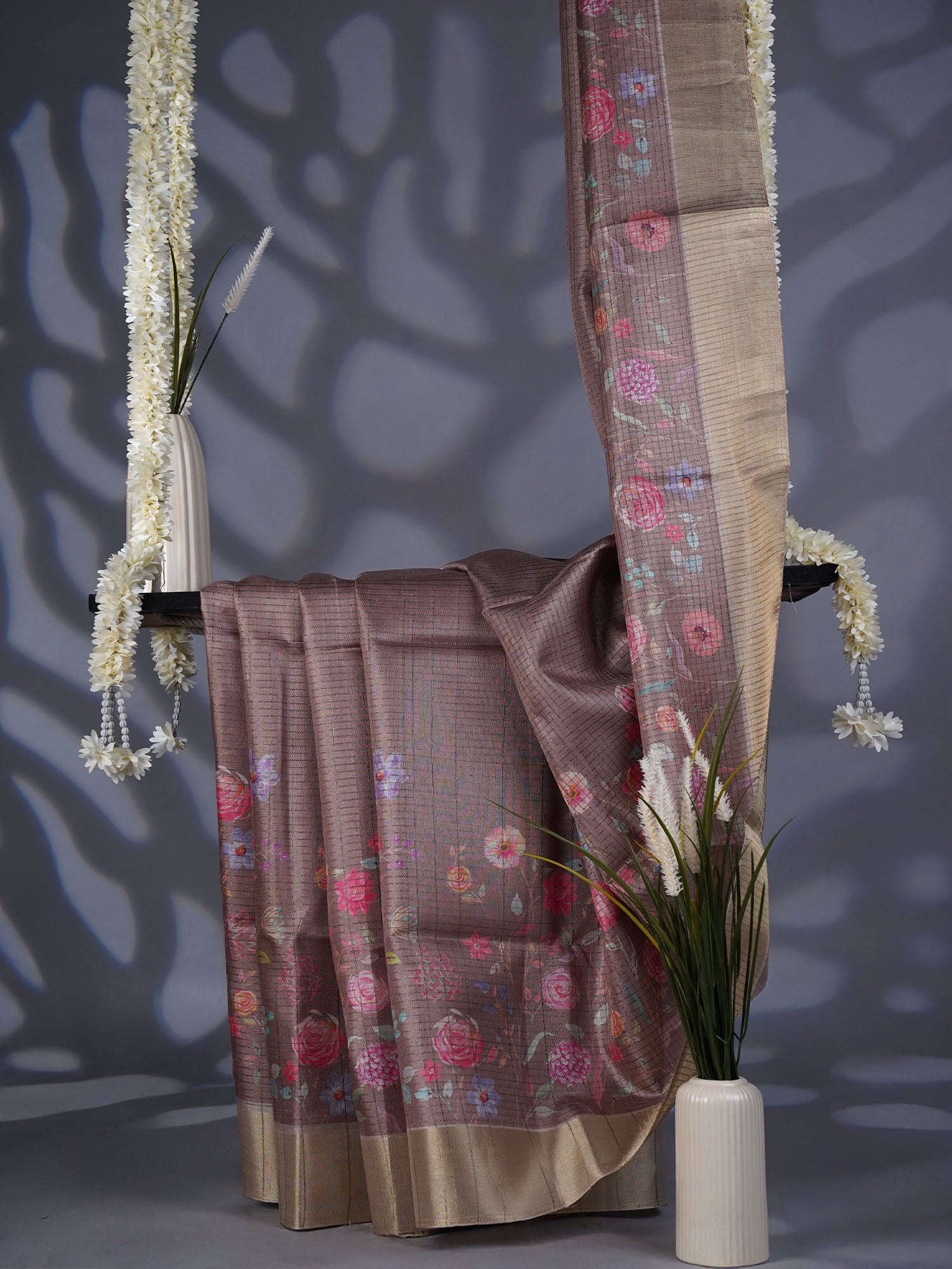 Tusser Silk Saree with Floral Print Contrast Border- Coffee Brown