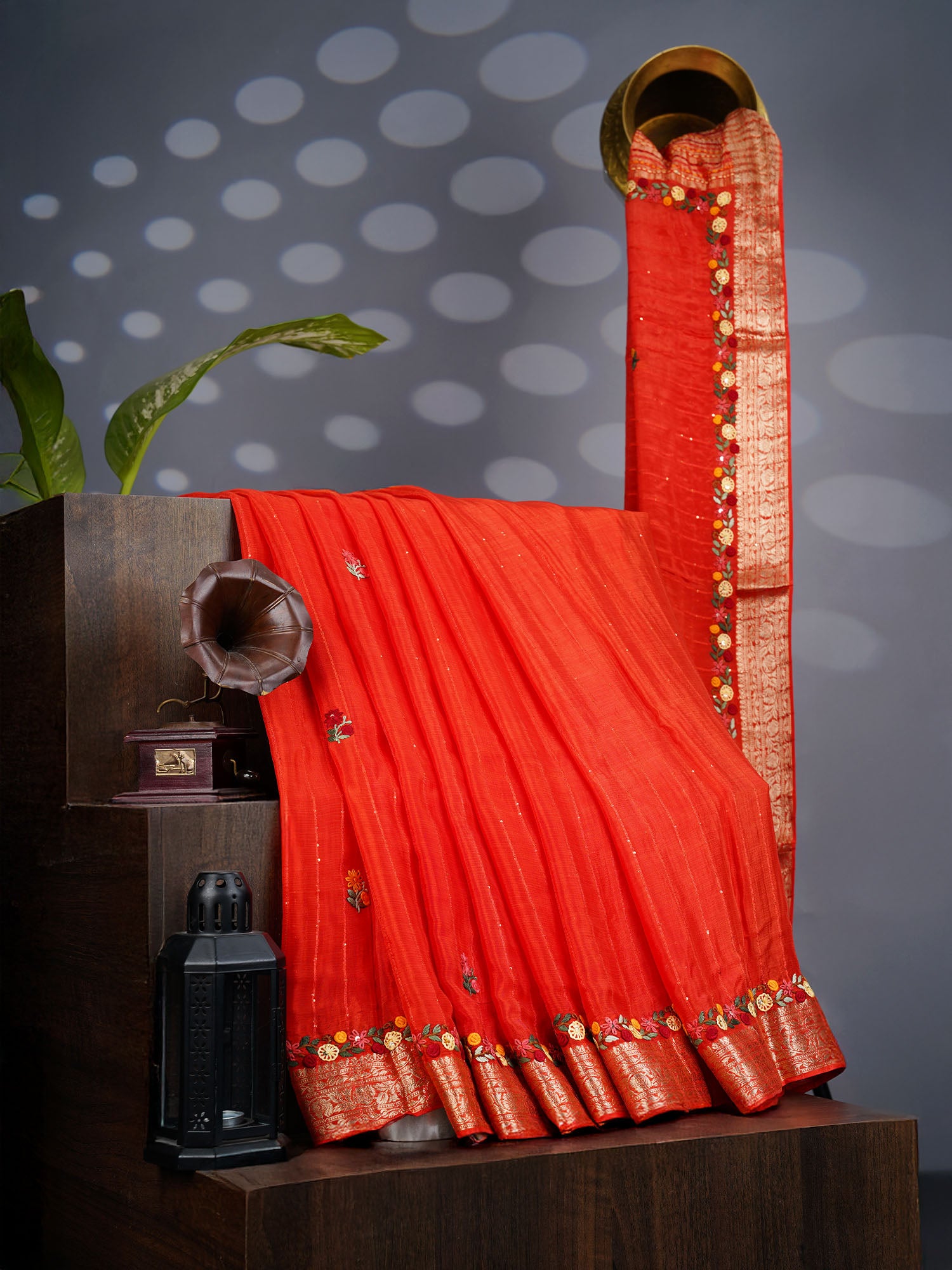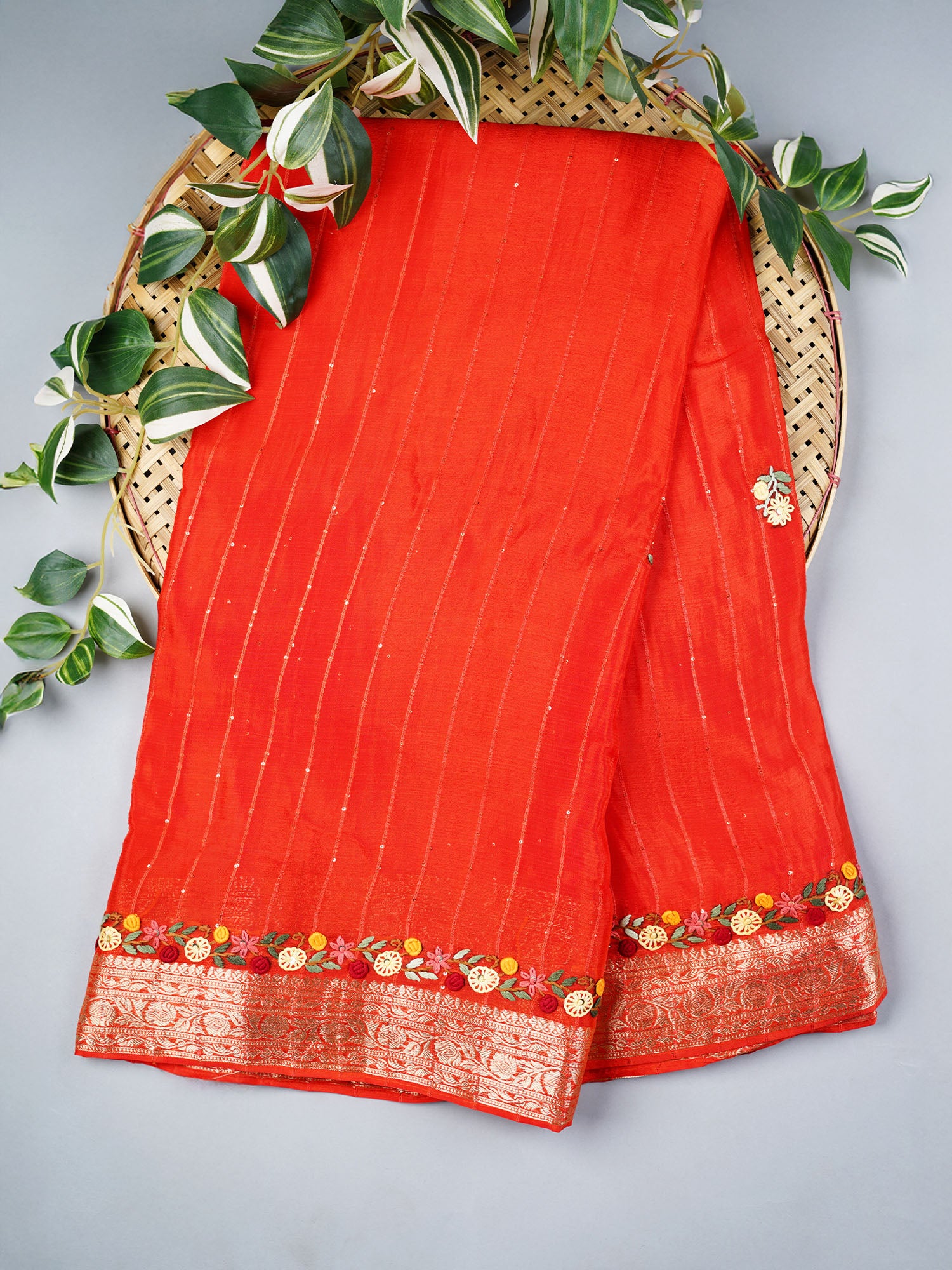 Wrinkle Crepe with Thread Embroidery Work Border- Orange
